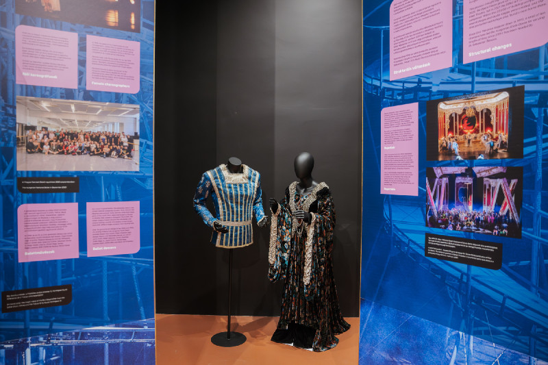 A tárlat az intézményhez kötődő jelentős ősbemutatókat is felidézi, köztük Bartók A kékszakállú herceg vára és A fából faragott királyfi, valamint Kodály Székely fonó és Háry János című művét, Harangozó Gyula és Seregi László balettjeit vagy a közelmúltból Eötvös Péter Valuska című, Krasznahorkai László regényéből komponált operáját. A tárlat az operajátszás mindennapjaiba is betekintést kíván adni a látogatóknak. A színházi kulisszák hátoldala egy-egy emlékezetes munkatárson, történeten, műhelytitkon vagy tárgyon keresztül idézi meg a háttérben dolgozók világát.