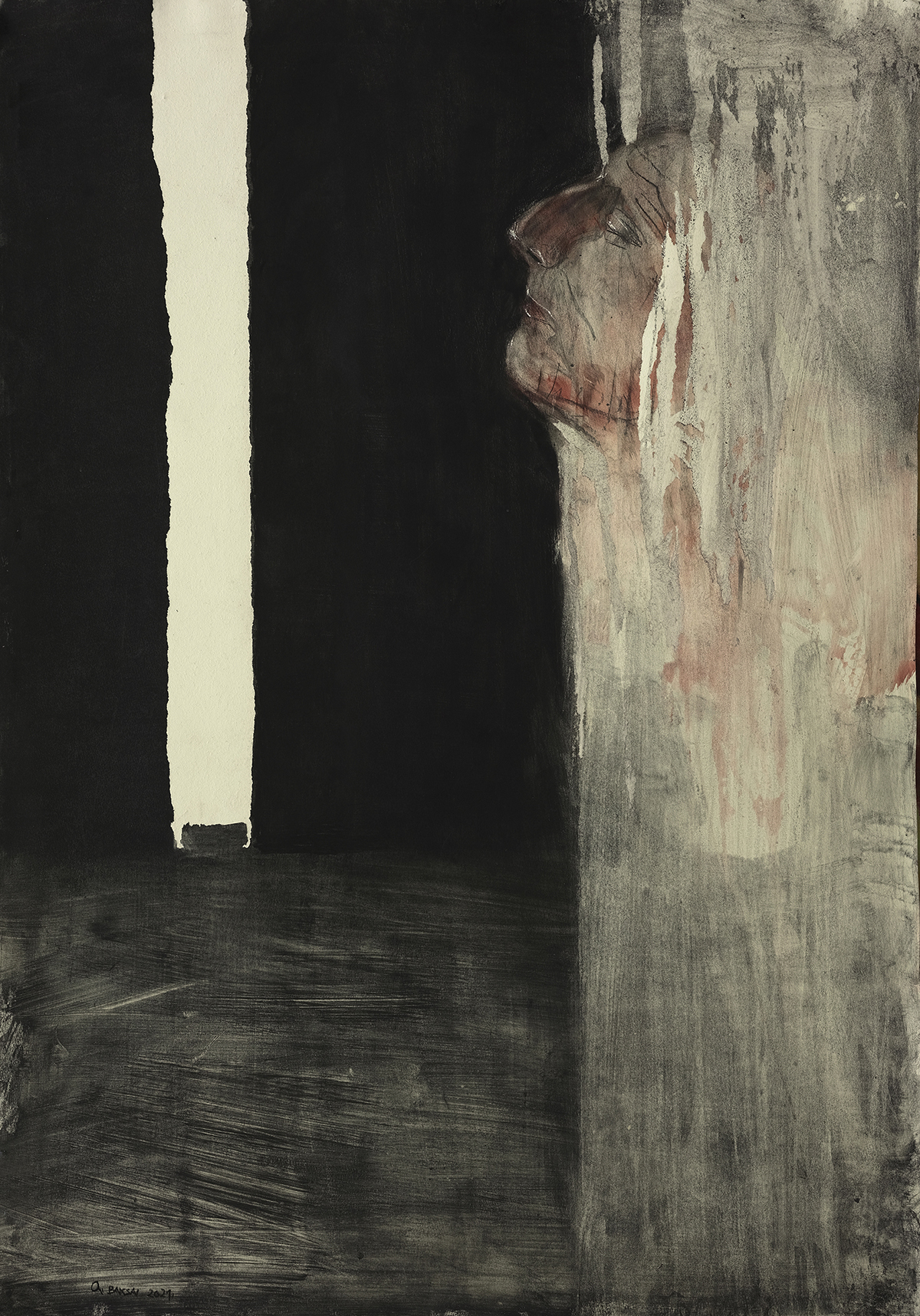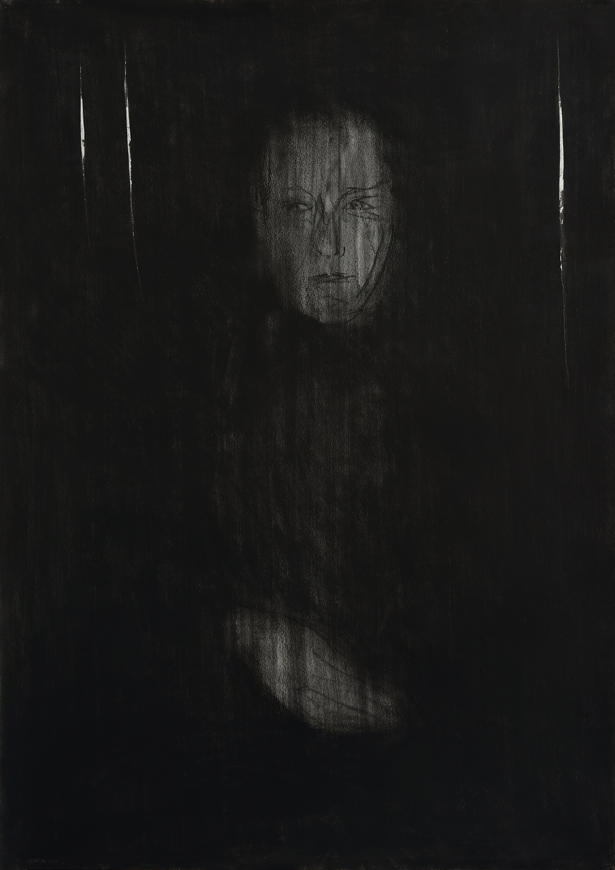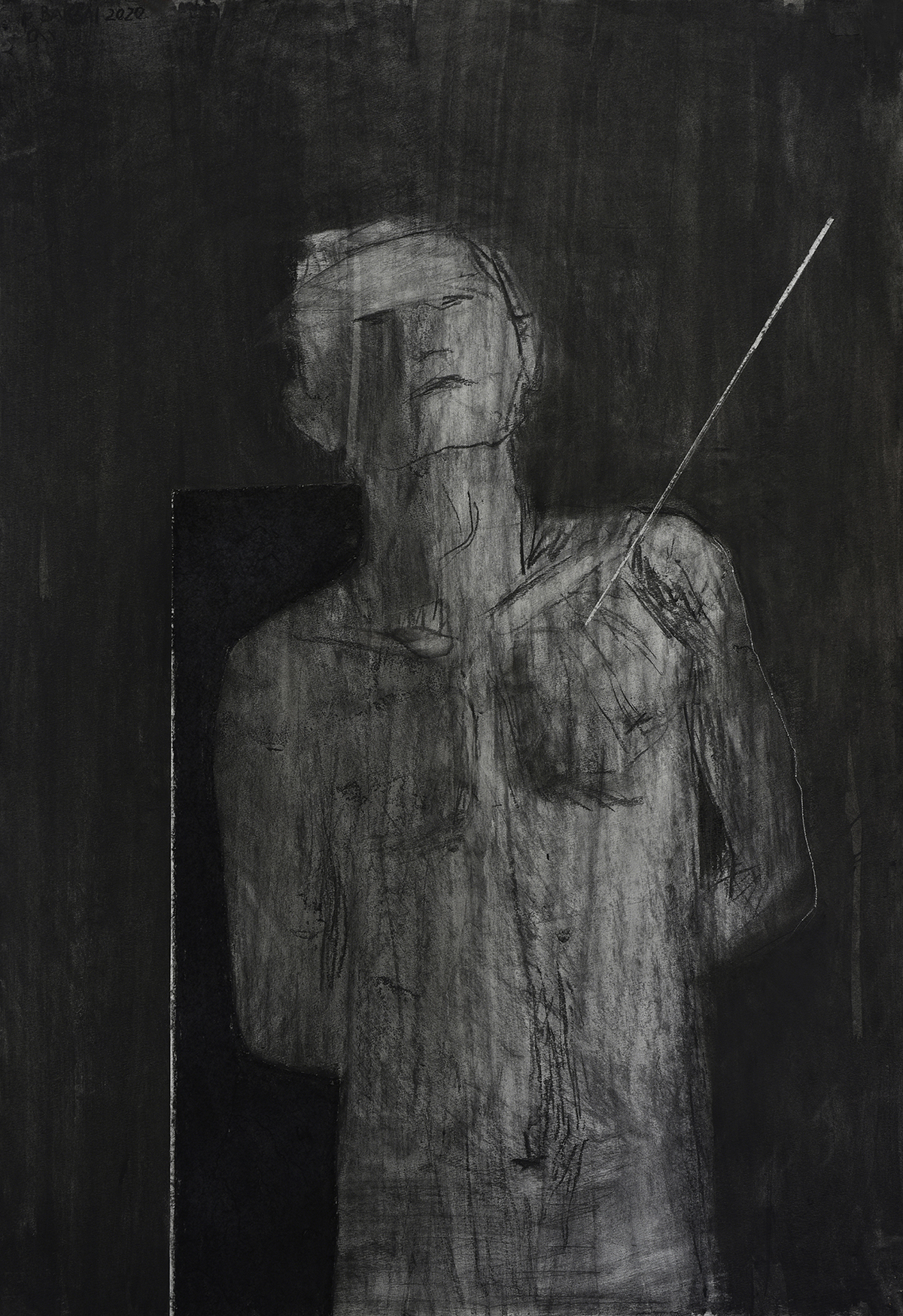 A művész szén- és pasztellrajzainál ez a kettősség még inkább egybeolvadva jelentkezik. Egyfajta remitologizálási folyamatként a személyesség erejével aktivizálódik, az idealizált konzerváltság helyett, az antikizálás formai kötöttségén kívül helyezkedve a mitikus létállapotban rejlő identitás problémáit fejezi ki. A befelé irányuló drámai helyzetek eszkatologikus auráját fokozza a faszénnel rajzolt háttér negatív, inkább eltűnést sugalló térnélkülisége. A figurákat elnyelő feketeségben, a feloldódás és kihasítottság kettősségében az önfeladó áldozathozatal magányát, a mártíromságból fakadó gyötrelem misztériumát érezzük. A lecsupaszított térben a létezés mint egzisztenciaprobléma a beteljesületlen vágy vagy gyötrelem állandósága miatt a napvilágra kerülés előtti derengésben jelenik meg. A barokk tenebrizmus, a titokzatos komorság festői látomásként egy kimerevített pillanatot hasít ki a sötétségből, a mítosz történetekből, cselekvésekből szövött jelkép, amely túlmutat önmagán. Ikonikus képben tömörítve emblematikus egyszerűségben létezhet a mitikus történet, s ez a tömörítés mégis tágító asszociációs aurává válik.