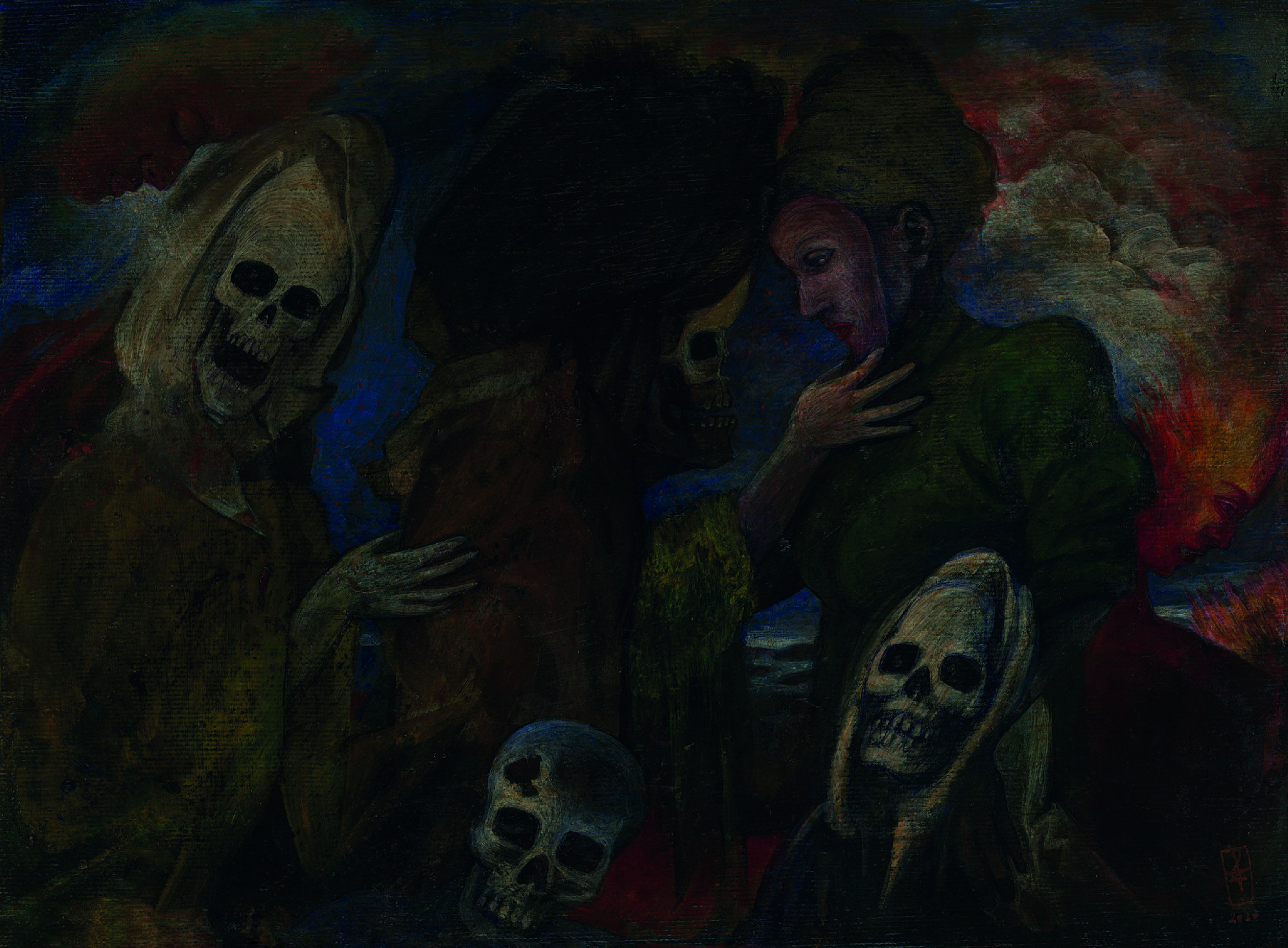 szimbólumokkal és a körülöttük szinte díszletként megjelenő ég, vöröses hangulatú tájakkal egy nagy haláltánc – danse macabre – idézőjelbe tett lenyomatai. A Szerelem, illetve a Jövendőmondó színességében, kompozíciójában és hangulatában is a múlt századforduló rettegő, pesszimista szimbolizmusát és különösen James Ensor képeit idézik fel. A Meghívás egy színjátékra és a Várakozás a Szurcsik által oly sokat festett barokkos-romantikus tájképek elé állított Halál, aki vagy egy függöny elé lépve lángoló koponyájával hirdeti az elmúlást – melynek külön hangsúlyt ad a háttérben lángoló, füstölgő vulkánok sora –,