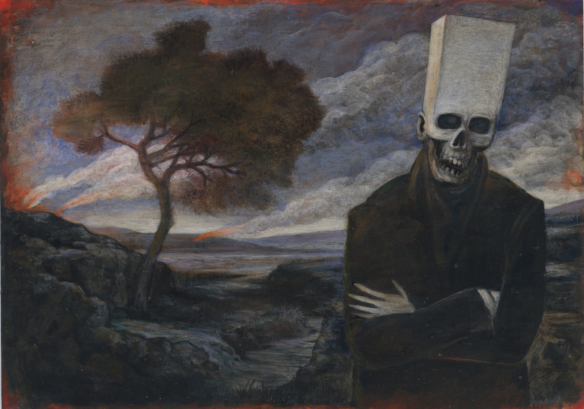 vagy épp a Szurcsik-védjegy falember öltözik be a halál rekvizitumaiba és egy magányos, szélfútta fa előtt jelenik meg rettentő vigyorával. Az Új hősök két öltönyös, bikafejű hőse, a háttérben vöröslő-pusztuló tájjal, e haláltánc mai szereplőiként tekintenek ránk.