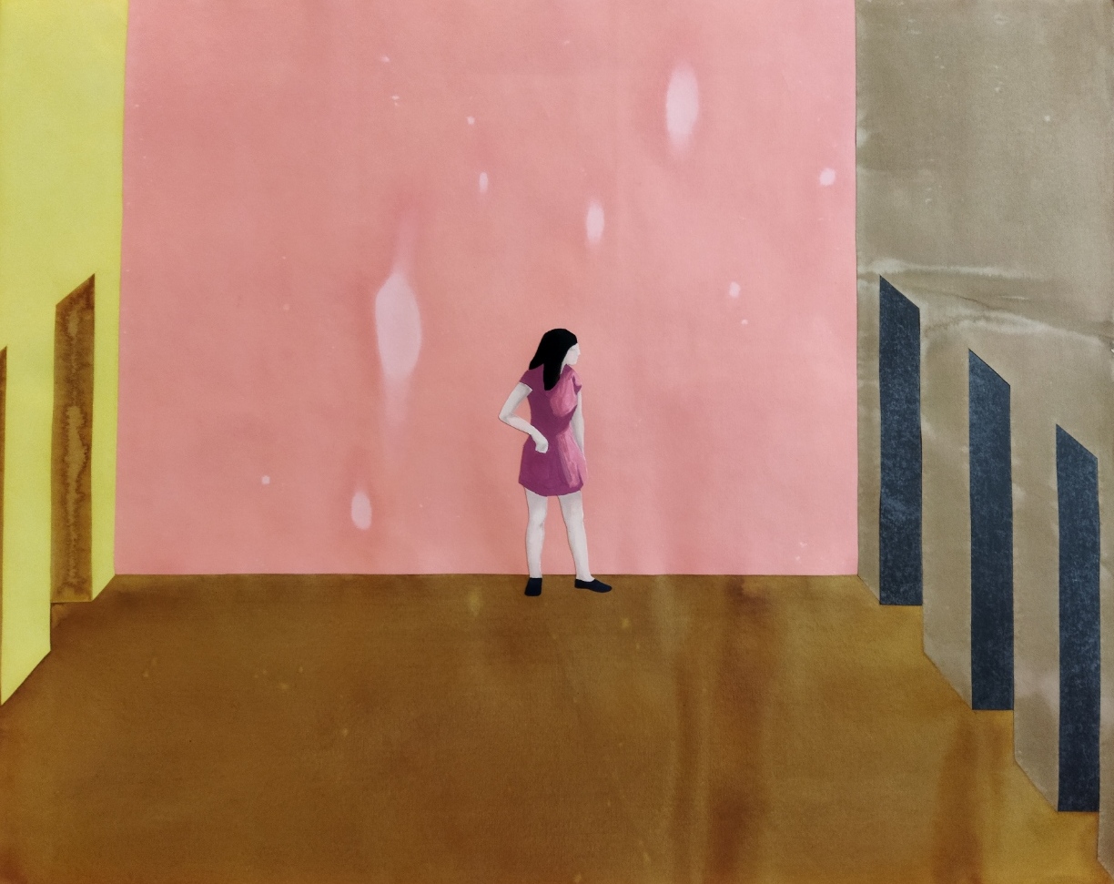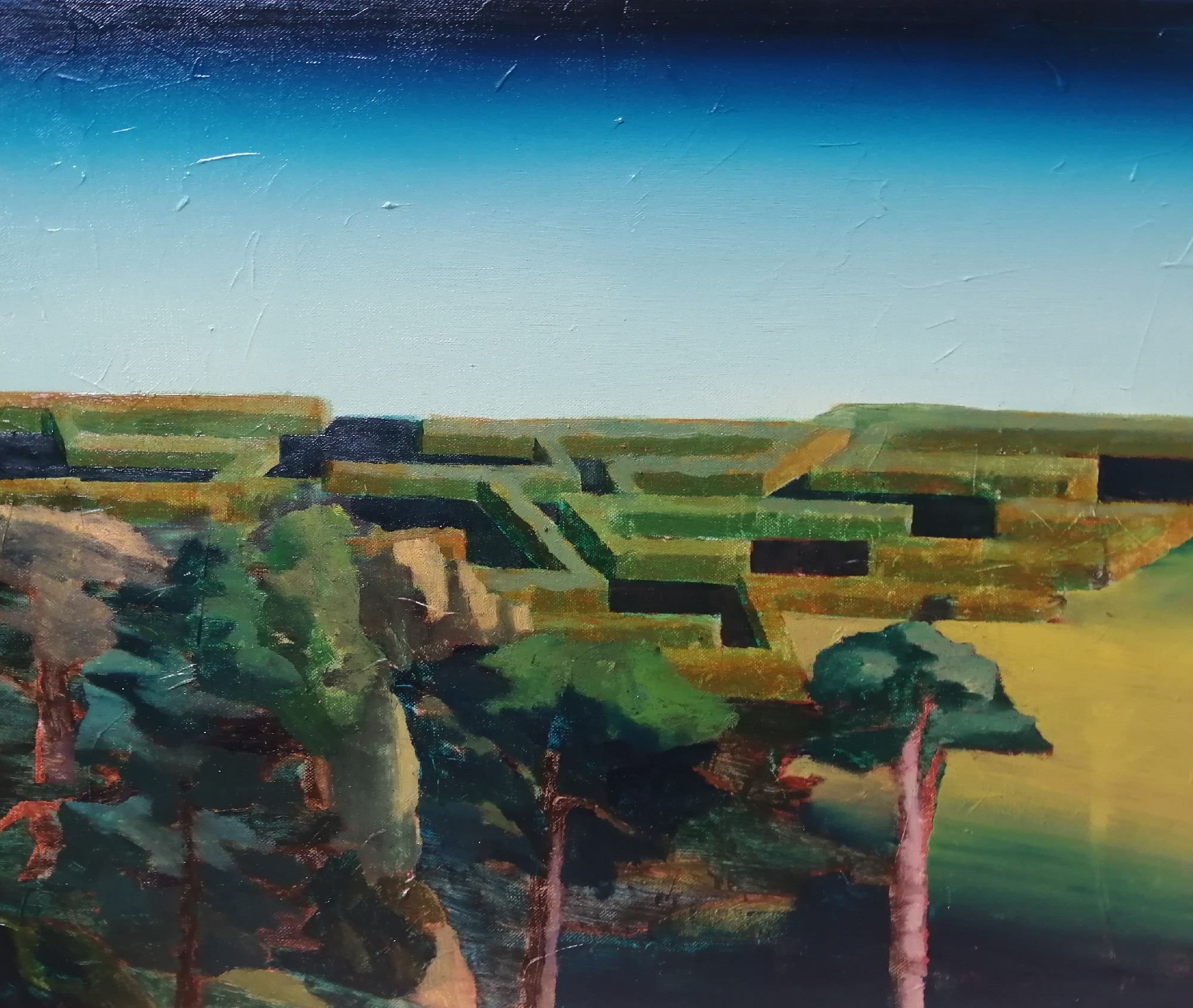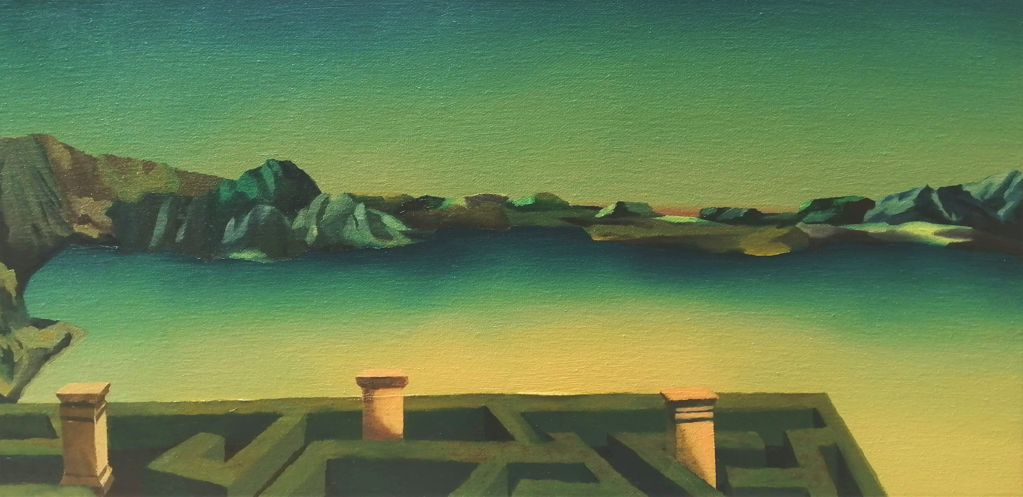 Tájképeket látunk, melyek ugyan valódi táji motívumokból állnak, összhatásukban mégis inkább állomképeknek hatnak, melyek képzeletbeli vidékekre invitálnak. Az ég halványan derengő, finom tónusátmenetekből épülő felület, felhőtlenül, éppoly simán és egyenletesen feszül a horizont fölé, mint az alatta elterülő, olykor tükröződő vízfelület. Sokszor e kettő között feszül az emberlakta természet furcsán letisztult tere, ahol mintha mindenki mellékszereplő lenne, mint ottfelejtett staffázsfigurák, akiknek sorsáról, személyiségéről, történetéről éppannyira nem tudunk meg konkrétumokat, mint magáról a tájról, ahová vetődtek. Apró alakjuk semmi egyediséget nem hordoz, arcuk sematikus, ruháik semmitmondók, tartásuk tanácstalanságot, tétovaságot sugall. Nem résztvevői, inkább szemlélői a tájnak, akárcsak mi, befogadók, akik a képen kívül tartózkodunk.