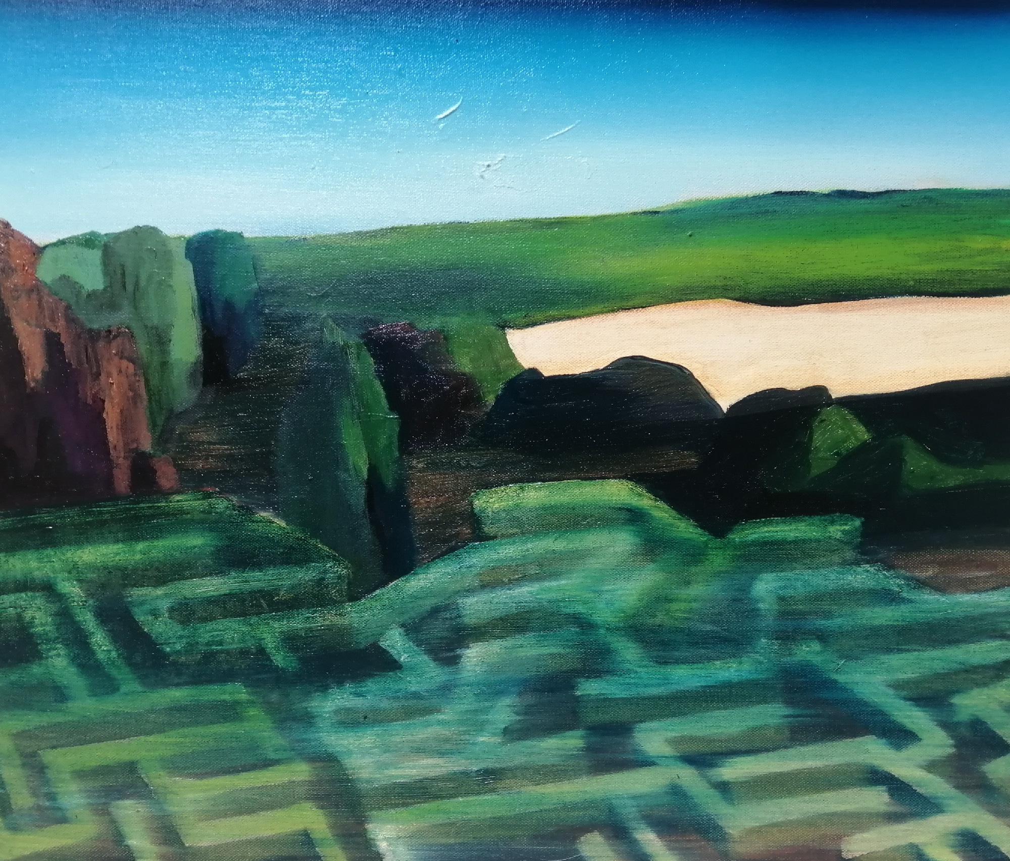 De mondhatnék más példát is. Ami többször felvillan képzeletemben a festmények láttán, A varázsfuvolának, Mozart operájának színpadképe volt, ahol a főhős és kísérője épp a helyes utat keresné Sarastro palotája felé, vagy éppen a halálos vízpróba előtt állna. Ezt a gondolattársítás erősítik az ösvények, a nyílások, a lépcsők, melyekről – akárcsak egy színpad esetében – nem tudjuk meg, hová vezetnek, de abban biztosak vagyunk, hogy miként a címadás is utal rá, talán akkor járunk a legjobban, ha metaforikusan értelmezzük őket. Ismét elérkeztünk tehát az értelmezés kényszeréhez, amely a fenti párhuzamot alapul véve bizony egyáltalán nem egyértelmű. A hasonlóság azonban nemcsak az olvasatok sokféleségében rejlik, hanem a meseszerű megfogalmazásban is, hiszen, akárcsak A varázsfuvola, elsőre Mayer Hella képei is mesés hangulatot árasztanak. De ahogy Mozart operája sem gyerekmese, Mayer Hella festményei sem mesebeli világba vezetnek, sokkal inkább szólnak az emberi élet egzisztenciális választásairól, melyek meghatározzák életünk további alakulását, ahogy erre az Útválasztó beszédes címadása is utal. Döntéseink megismételhetetlenek és visszafordíthatatlanok, de a festmények szereplőivel ellentétben legalább vannak segítőink.