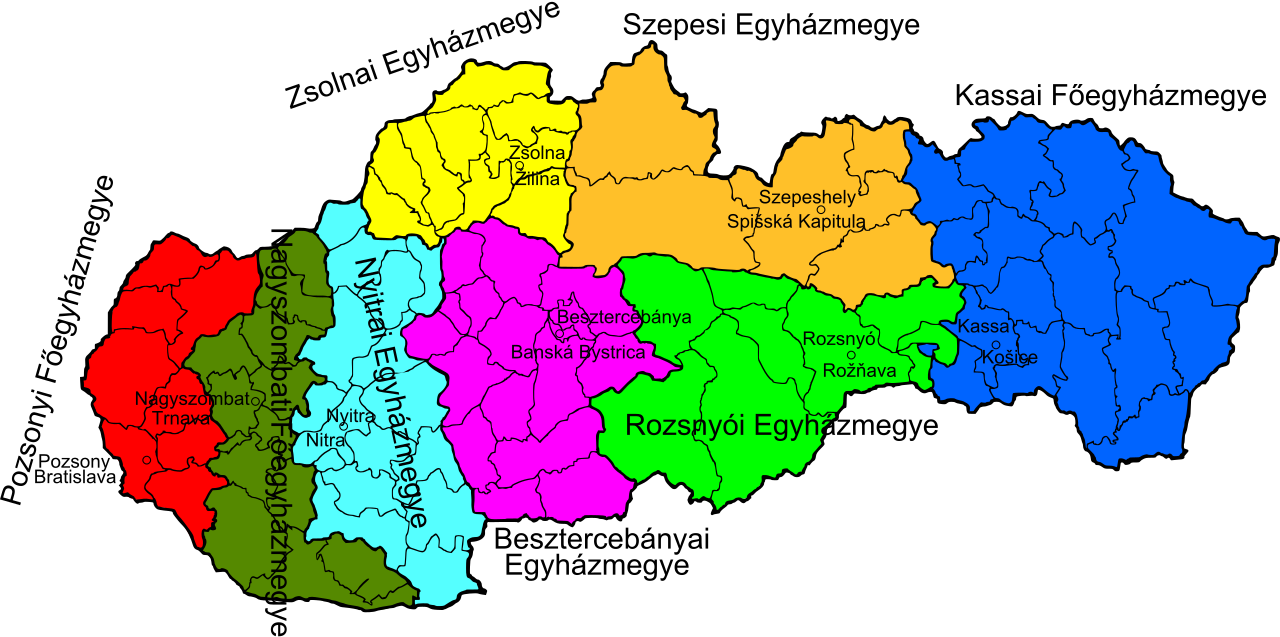 Szlovákia 2008 utáni, ma is érvényes egyházmegyehatárai követik a polgári megyehatárok logikáját, magyar szempontból – észak–déli irányt követve –