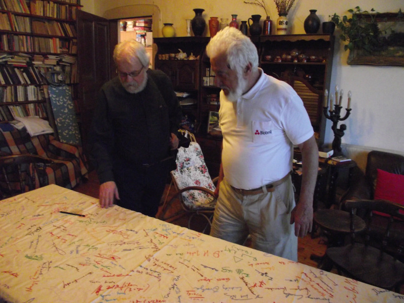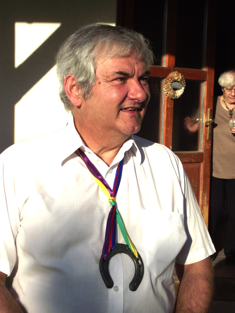 Hetvenéves születésnapján piliscsabai kertjükben, barátok között, a Patkoló jelvényével