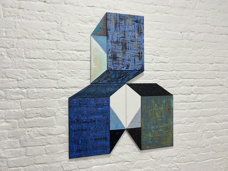 Festőpalettára installált vásznain az ősi elemeket szimbolizáló, kalligrafikus, ismétlődő motívumok elevenednek meg. Az installált művek egyszerre látszódnak is, meg nem is, kívül is vannak, meg belül is, s a külcsín és a belbecs kettősségét vonultatják fel. A kétoldalú festményeken egyszerre jelennek meg a sötétebb tónusú, pasztelles, letisztultabb formák, valamint az élénk, gesztusszerű foltok, melyek részletgazdag belső világot engednek láttatni, de csak azoknak, akik közel mennek a munkákhoz. A benső emigrációba vonult lélek gyakran olyan finomságokat rejt, amelyeknek a felfedezéséhez valódi odafordulás szükséges.
