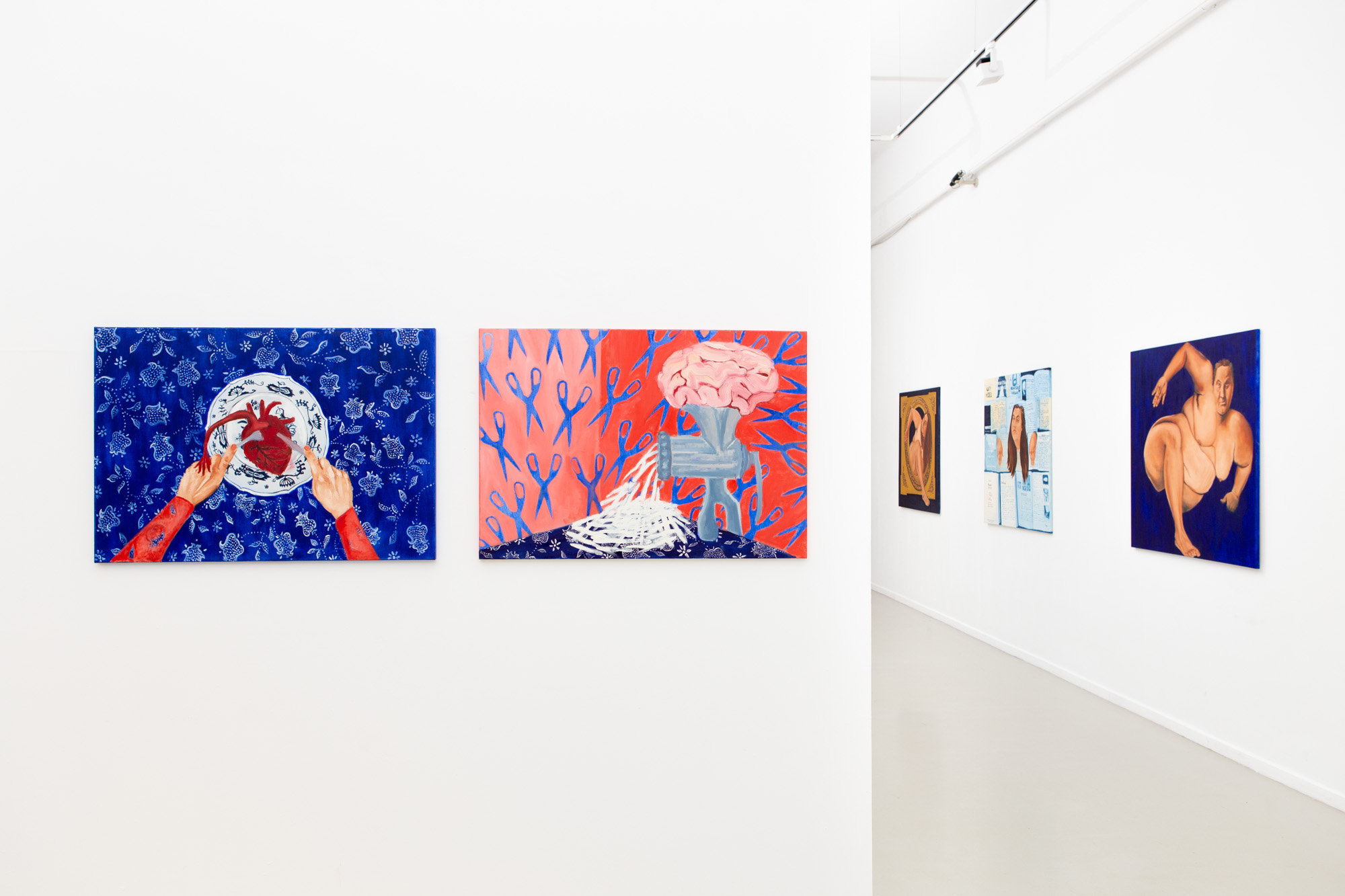 A kiállítás előterében ismerős motívumú festményeket láthatunk: például a nyitott olló a Türelem rózsát terem című performanszod óta visszatérő képelem, ami mindig valamit elvág, megszakít. Vagy az agy és a szív anatómiai pontosságú ábrázolása, mely az érzelmek és értelem vívódásai felől közelítve szintén ismerős már a Horváth Lóczi Judittal közös kiállításotok, a Similar stories óta. Milyen kapcsolódásban állnak egymással a korábbi és a mostani új sorozatod festményei?