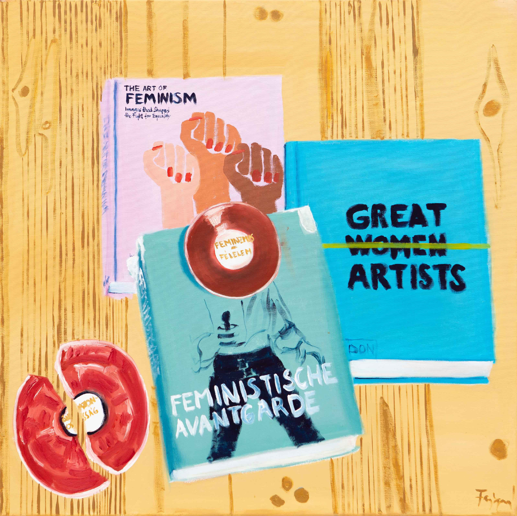 Pontosan ezt történt. Érdekes volt például a kiállításmegnyitón Martos Gábor (többek között az Önarckép nyaklánccal – Női alkotók a műkereskedelemben című könyv szerzője) azt mondta, hogy ő már halhatatlan, mert a könyve meg van festve. Nem azért, mert megírta a könyvét, hanem mert az benne van a festményemben. Izgalmas oda-vissza játék ez. Egyébként 2012 óta festek könyvcsendéleteket. Abban bízom, hogy a festményeimet látva lesznek olyanok, akik előveszik ezeket a könyveket, és így beépülhet vagy újra érdekessé válhat egy-egy nőművész megismerése. Több képemen látható a Dictionary of Women Artists, amely olyan enciklopédia, amibe az összes ismert nőművészt lajstromba vettek. Fontos könyv továbbá számomra a Women in the Mirror is, amely azzal is szembesített, hogy bár sok nő önarcképét ismerem, de ezzel a műfajjal már sokan foglalkoztak, nekem valami újat kell találnom. De szeretek játékos asszociációkat is behozni a képekbe, például a Feminizmus című képemen a Great Women Artists, a Feminista avantgárd, Linda Nochlin és Hitka Viktória összetört ÖNBECSÜLÉS feliratú tányérját egy kompozícióba kapcsoltam össze.
