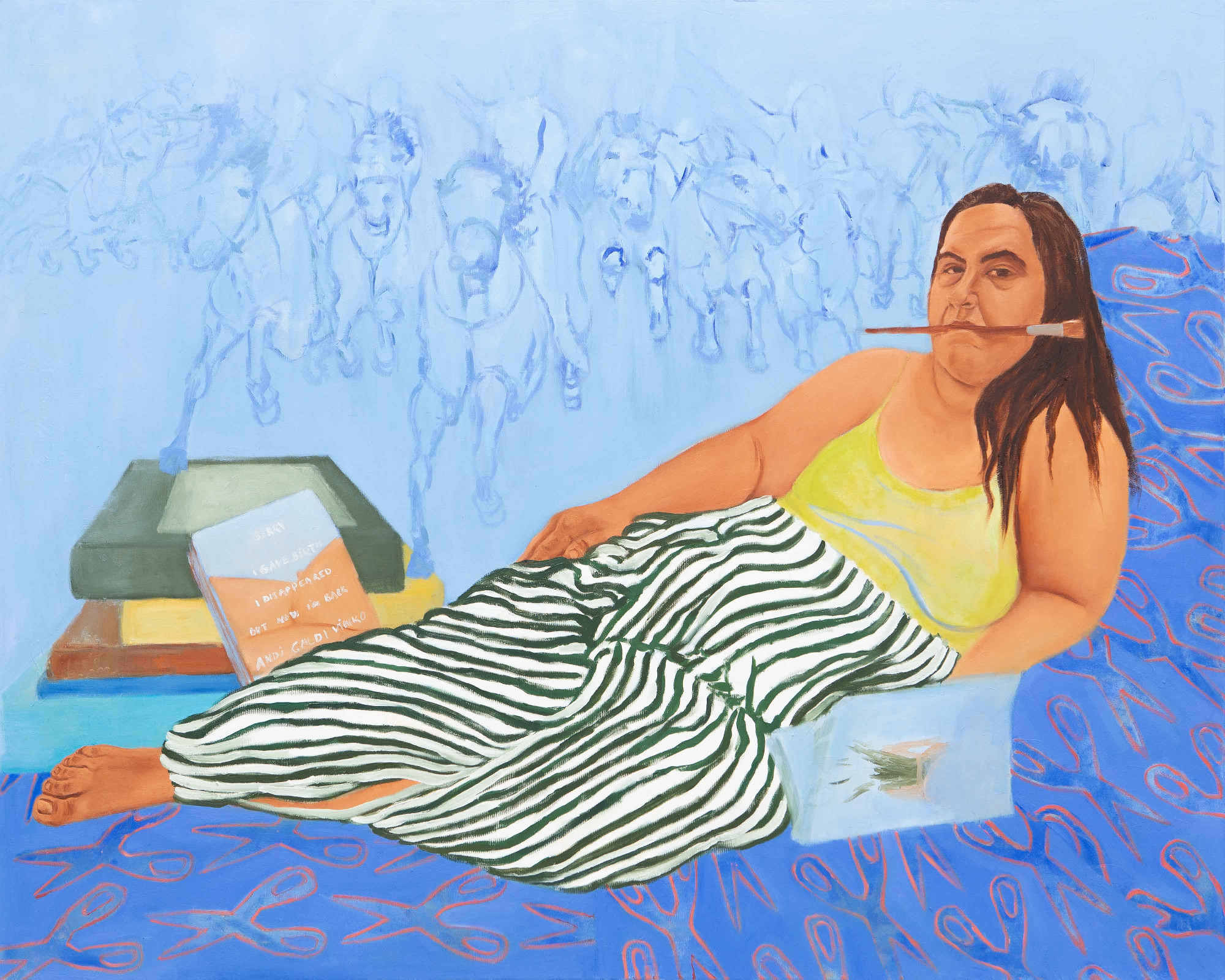 A kék szoba című festményem Suzanne Valadon The Blue Room (1923) című művének parafrázisa. A tudatos reflektálás mellett saját hozzáállásomat is belesűrítettem a kompozícióba. Valadon képzett festőművész volt, ám mégis leginkább férfi festők alkotásainak modelljeként ismerjük őt, ugyanis rengeteg aktot készítettek róla. Ő pedig saját magát Vénuszként – sőt Manet Olympiájának összetéveszthetetlen pózában – jeleníti meg. Ugyanebben a beállításban festettem meg tehát önmagamat én is, ugyanabban a fehér-zöld csíkos nadrágban – mert nekem is van ilyen! Lábainknál könyvek láthatók, én K. Horváth Zsolt Bundátlan Vénusz című könyvét tartom a kezemben. Valadon cigarettázva mereng, míg én az ecsetet, mint attribútumot a számban tartva tekintek a nézőre. De jól láthatóan itt van Gáldi Vinkó Andi díjnyertes könyvének, a Sorry I Gave Birth I Disappeared But Now I’m Back címűnek a borítója. A háttérben pedig egy korábbi festményemet, a Festőnőkkel a festészetért csatázom című képet idézem meg, amely egyébként egy Lady Butler-mű parafrázisa.