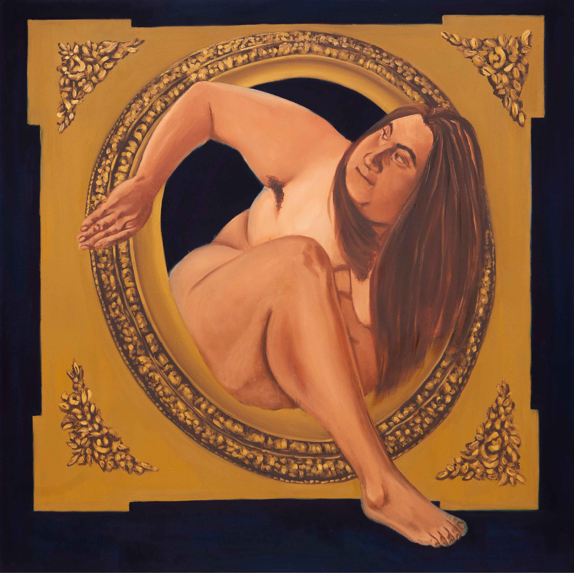 A kiállításban etalon Orlan művészetének megidézése. Tavaly tavasszal Bécsben egy katalógusbemutatóján személyesen is találkozhattam vele. Számos performanszát láttam, s művészete nagyon meghatározó számomra. Ő is saját testén keresztül hoz létre műalkotásokat, olyannyira, hogy sebészeti beavatkozásokat is rendszeresen végez magán. A Kitörés II. című festményem Orlan egyik hatvanas évekbeli fotójára reflektál. Én is ugyanazzal a mozdulattal lépek át egy kereten, ahogyan ő is tette. Az én kompozíciómban az az érdekes, hogy a súlyomat hogyan tudom megemelni, hogyan tudom átpréselni magam. Az is érdekes, hogy honnan lépek ki, mivel a háttér emblematikus ultramarin kékség, ami a háziasszonyságot jelző konyharuháim színe is. Eredetileg pedig Yves Kleinre emlékeztet, aki modelljeinek testét bekente ezzel a színnel, hogy testüket ecsetként használva alkosson. Én nem hagyom ezt a fajta tárgyiasítást, így egy határozott gesztussal kilépek belőle.