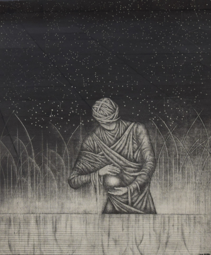 A grafikus legújabb munkái hasonló módon létösszegző gondolatokat mutatnak. A rézkarcsorozaton a fény születését, megragadását, őrzését kísérhetjük figyelemmel. A rajzokon és grafikákon a leginkább szembeötlő a technika, amellyel mintegy személyes áldozatot bemutatva veti alá magát a művész annak az alkotási folyamatnak, amelynek során az aprólékosan és teljes felületen kidolgozott, finoman megrajzolt, ceruzával és krétával kidolgozott képmező megszületik. Alázat: ezt érezzük mind a képek témáját, roskadó és felemelkedő, leplekben rejtőzködő alakjait szemlélve, mind a ceruza finoman rezgő nyomainak hálózatát, mintázatát tekintve, amint közeledünk képeinek hihetetlen felületéhez, majd távolodunk, hogy a fények és árnyékok játékát újra lássuk.