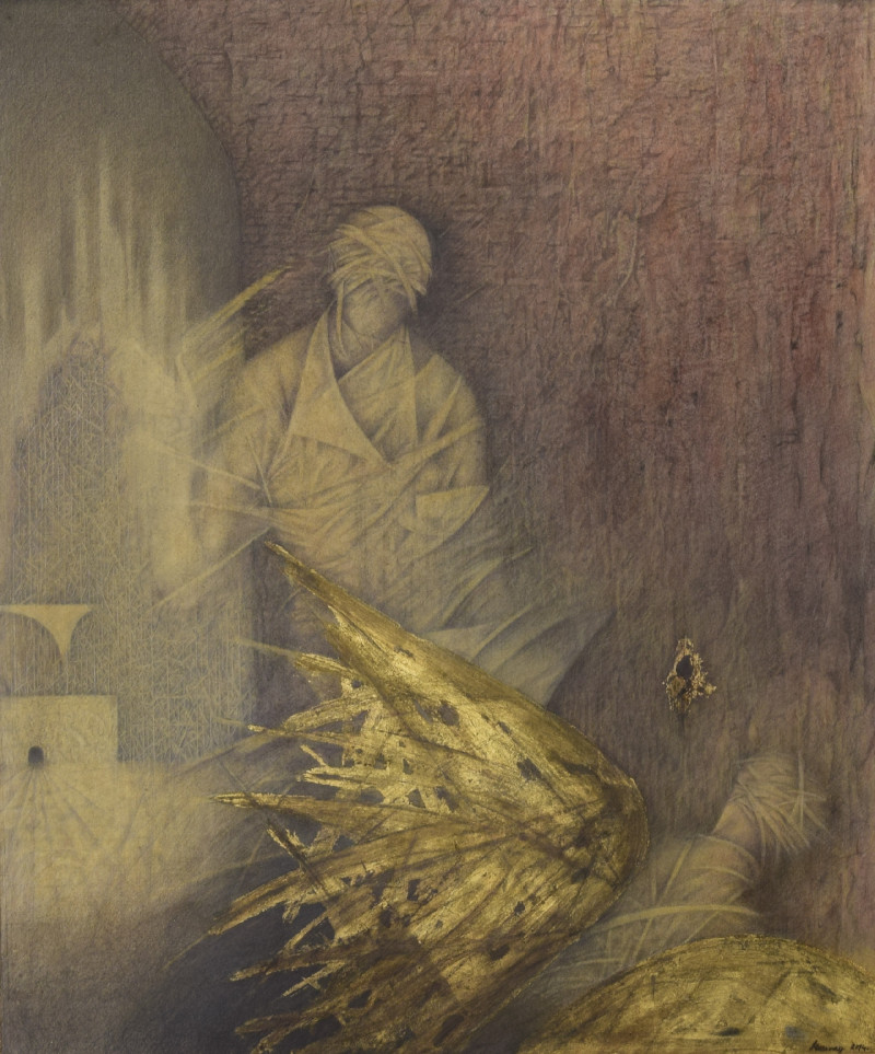 A művek háttere, helyszíne különös tér, meghatározatlan, végtelennek tűnő zóna, sejtelmes, titokzatos világ. A képtérben álló meditatív, melankolikus, alázatban összeroskadó, meghatározatlan alakok mély, lelki dimenzióból lépnek elő, bomló gyolcsokba pólyált testük rituális mozdulataival, beszédes kezükkel. A képeken csak a csendet halljuk, a megnyíló ég, a beszüremlő vagy lassan permetező fény csendjét, az ima, az alázat csendjét, a földi dolgok felesleges terheitől megvált lélek csendjét.