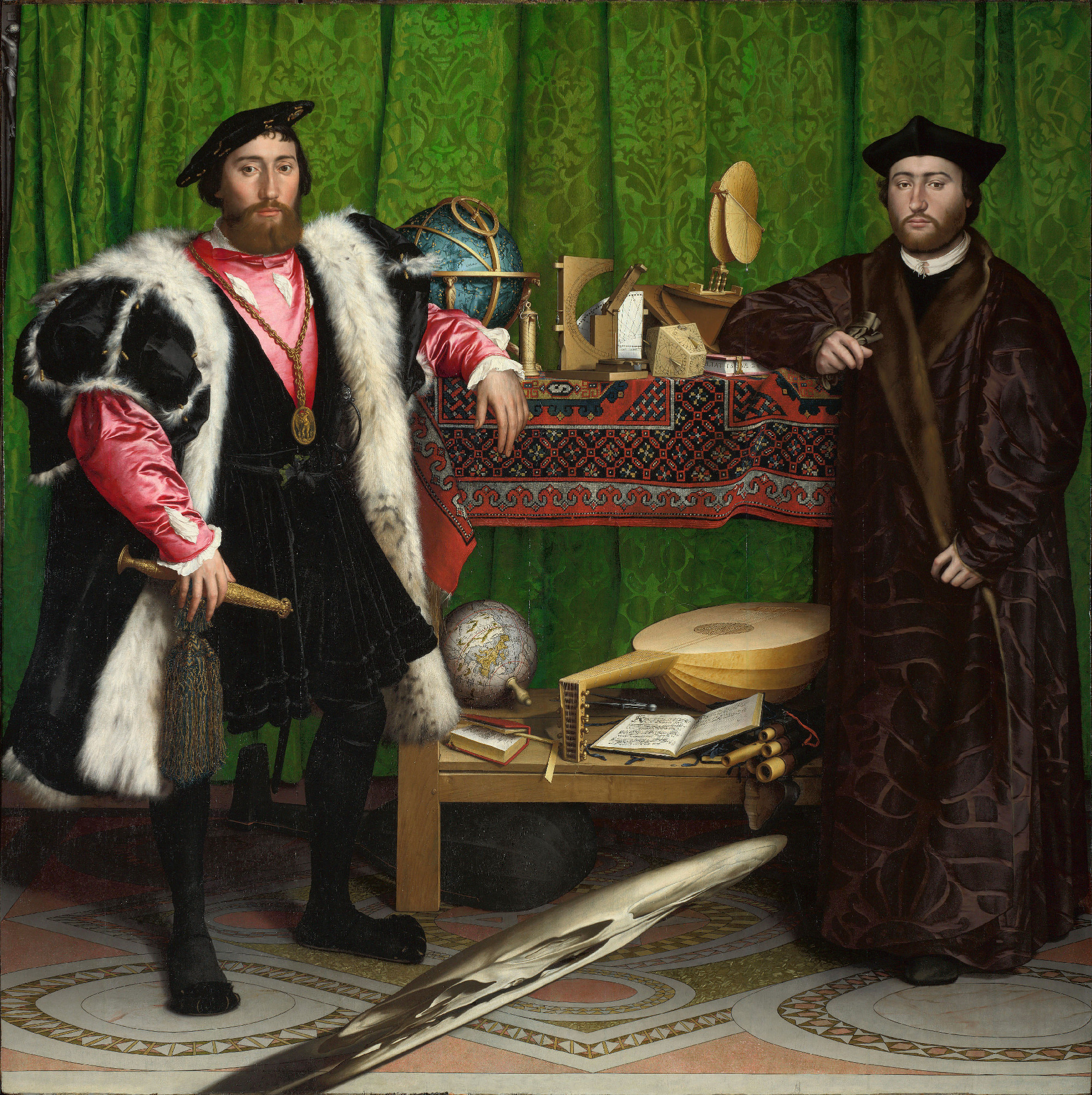 Hans Holbein leghíresebb képén két követet látunk VIII. Henrik idejéből, olyan dolgozószobában, melynek Holbein minden részletét aprólékosan kidolgozta. Ám a kép valódi főszereplője mégis a padlóra vetített emberi koponya lett, amelyet Holbein valamilyen speciális tükör segítségével torzított el. Hogy pontosan milyen speculumot használhatott Holbein, arról megoszlanak a vélemények. Sokak szerint a lenti képen látható üvegcsövön keresztül a koponya normális formájúnak látszik. Illetve: hellyel-közzel szintén visszanyeri eredeti formáját, ha néhány lépés távolságból és bal oldalról nézzük. Ugyanakkor az sem zárható ki, hogy a restaurációk során a koponya tovább torzult. Ám a legfontosabb kérdés: mit akarhatott Holbein ezzel a brutális memento morival kifejezni ezen az előkelő képen?