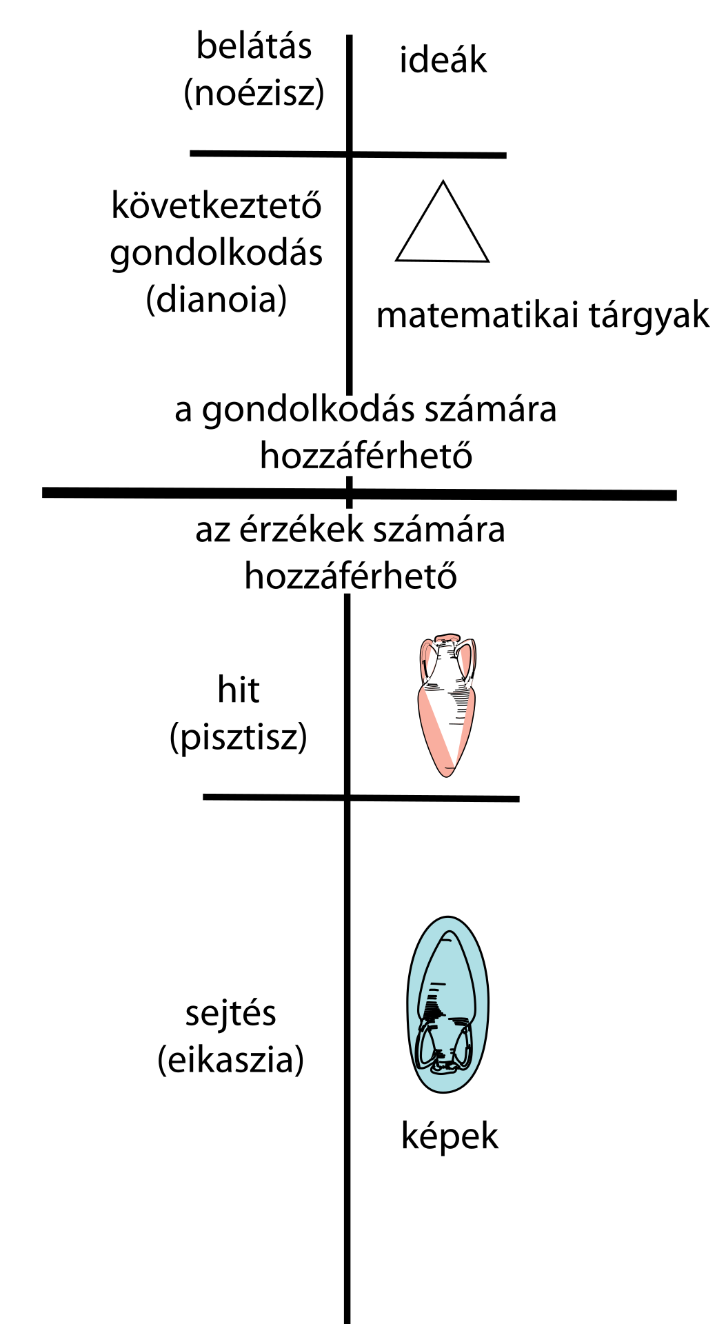 Annyi biztos, hogy a polcokon látható tárgyak között egyfajta hierarchia uralkodik, ami leginkább Platón „vonalhasonlatára” emlékeztet. Platón szerint az ideák világát éles cezúra választja el a látható dolgok világától, amelyek csupán azok árnyékai, és maguk is árnyakat és tükörképeket vetnek. Az ideák világához legközelebb esők az égitestek, számok, zenei harmóniák és geometriai alakzatok. Holbein csendéletének legfelső polcán a csillagképeket és csillagkonstellációkat felvonultató éggömb mellett csupa bonyolult csillagászati műszer – kvadráns és napóra – fekszik: ezek jelzik az ideák világának közelségét, amit a vörös perzsaszőnyeg gazdag geometriai mintázata erősít meg. A középső polcon már a valódi földgömböt látjuk, eggyel lejjebb ereszkedtünk tehát, ám tudatszintünk még mindig rendkívül magas: ezt jelzik a hangszerek és kotta. A legalsó polcon viszont már az amorf koponya uralkodik mint az emberi értelem eltorzult változata és mint az ideák tükörképének eltorzult tükörképe, tehát a „vonalhasonlat” legalsó szintje. Holbein zsenialitása mindenekelőtt a vörös-zöld színkomplementerek és formai analógiák – éggömb, földgömb, mandolin, koponya – maximális kihasználásában rejlik, illetve abban, ahogyan a hagyományos memento morit újféle jelentéstartammal ruházza fel azáltal, hogy a koponyát trükkösen megtükrözi zenei disszonanciát keltve. Lényegében a követek tárgyalásán múlik, hogy a bonyolult kalkulusokat miként használjuk fel: bolygópályákat számolunk-e vele vagy rakétaröppályákat?