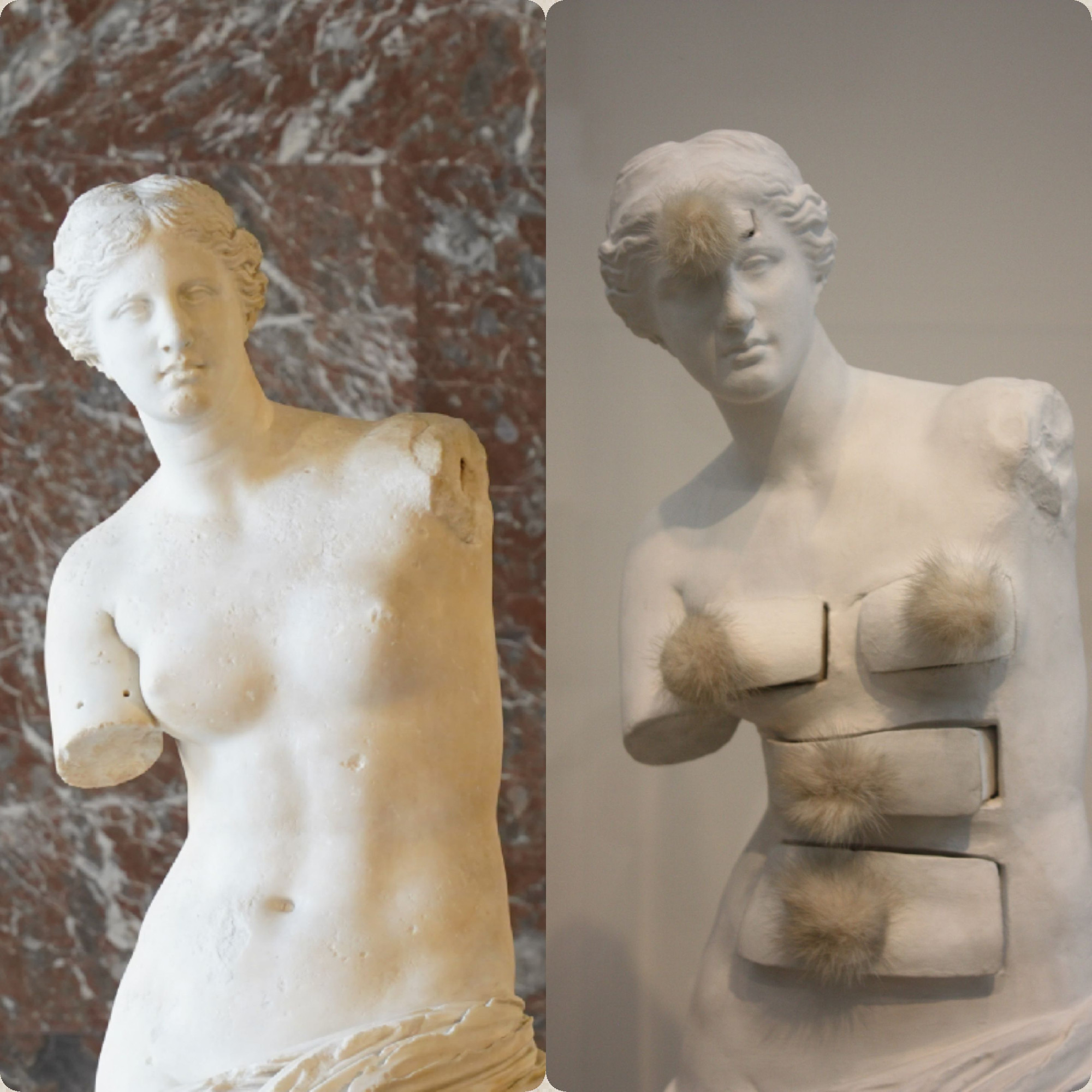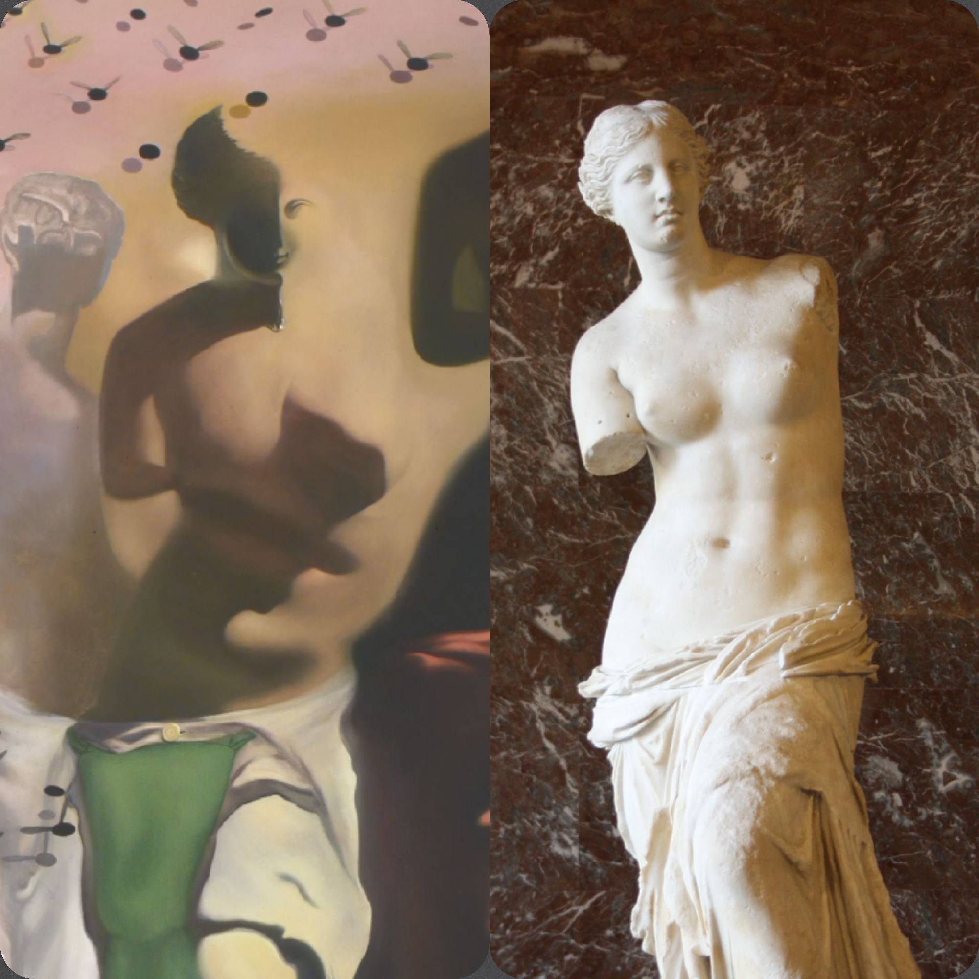 Mégis: a Milói Vénusz titka nem feltétlenül hibátlan szépségében és anatómiai arányaiban rejlik. Egyszerűen el kell fogadnunk, hogy a Mona Lisa és a Milói Vénusz olyan esztétikai „hipertárgyak”, melyek elementáris hatást gyakorolnak kultúránkra, megszámlálhatatlan tudományos hivatkozással rendelkeznek, és extrém mennyiségű letöltést generálnak a világhálón. Elsőként Timothy Morton publikálta a fizikai hipertárgyak elméletét 2013-ban. Morton fizikai hipertárgyai olyanok, mint a Nap: elemi erővel hatnak környezetükre, és nem lehet őket megismerni, sem kontrollálni. Csakhogy az „őrült zseninek” tartott Salvador Dalí évtizedekkel Morton fellépése előtt képes volt érzékelni bizonyos objektumok „hiperségét”. Legalábbis erre következtethetünk azokból a „blaszfémiákból”, melyekkel mindenekfelett a Louvre két legnagyobb büszkeségét: a Mona Lisát és a Milói Vénuszt tüntette ki. Dalí ezúttal nem parafrázisokat alkotott belőlük, mint Bernini elefántjaiból vagy Millet képeiből, hanem nyíltan „kifigurázta” őket. Így jött létre a Bajuszos Mona Lisa és a Fiókos Milói Vénusz.