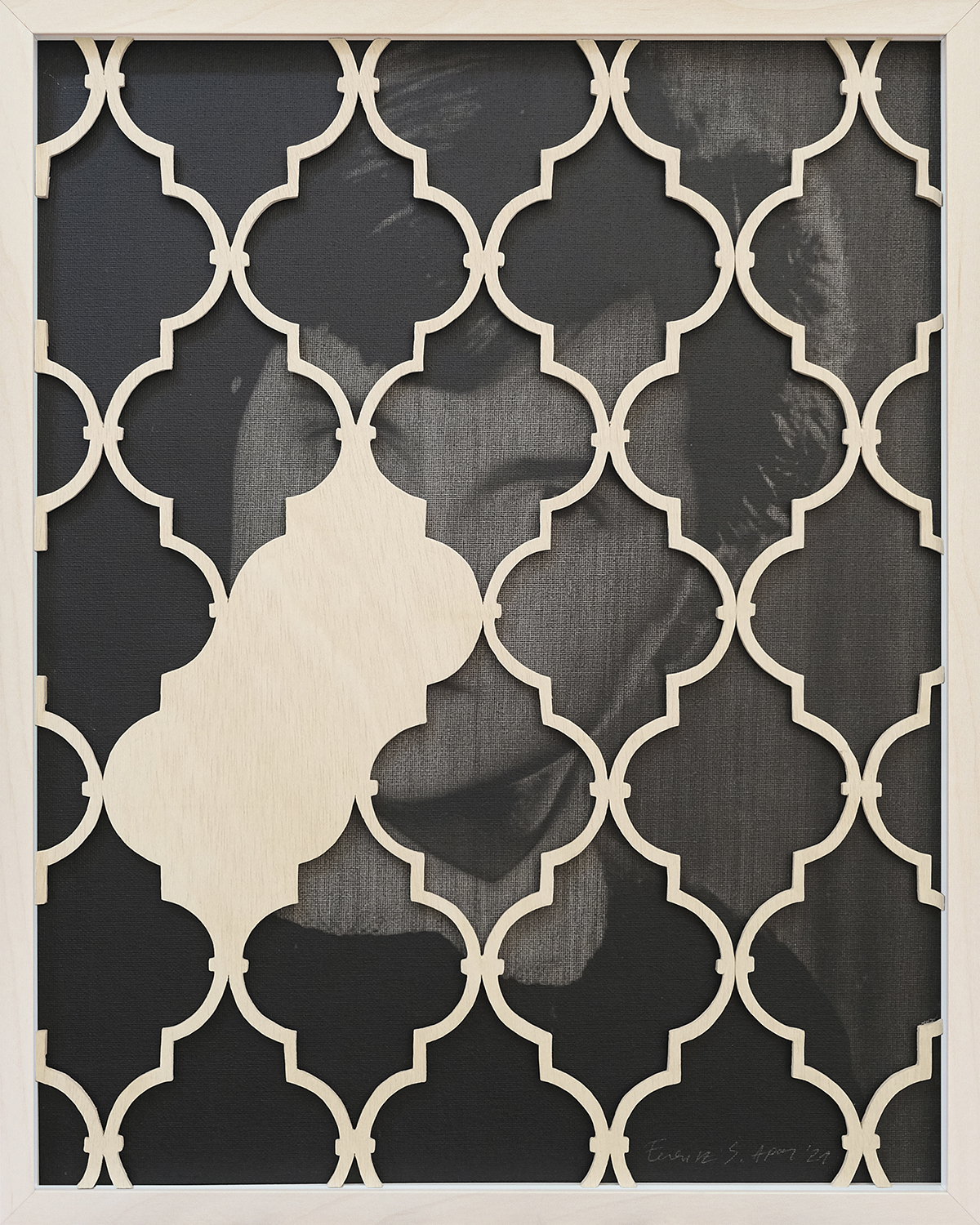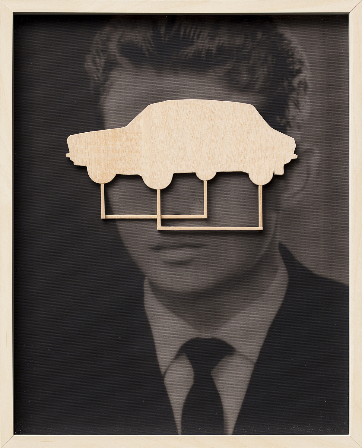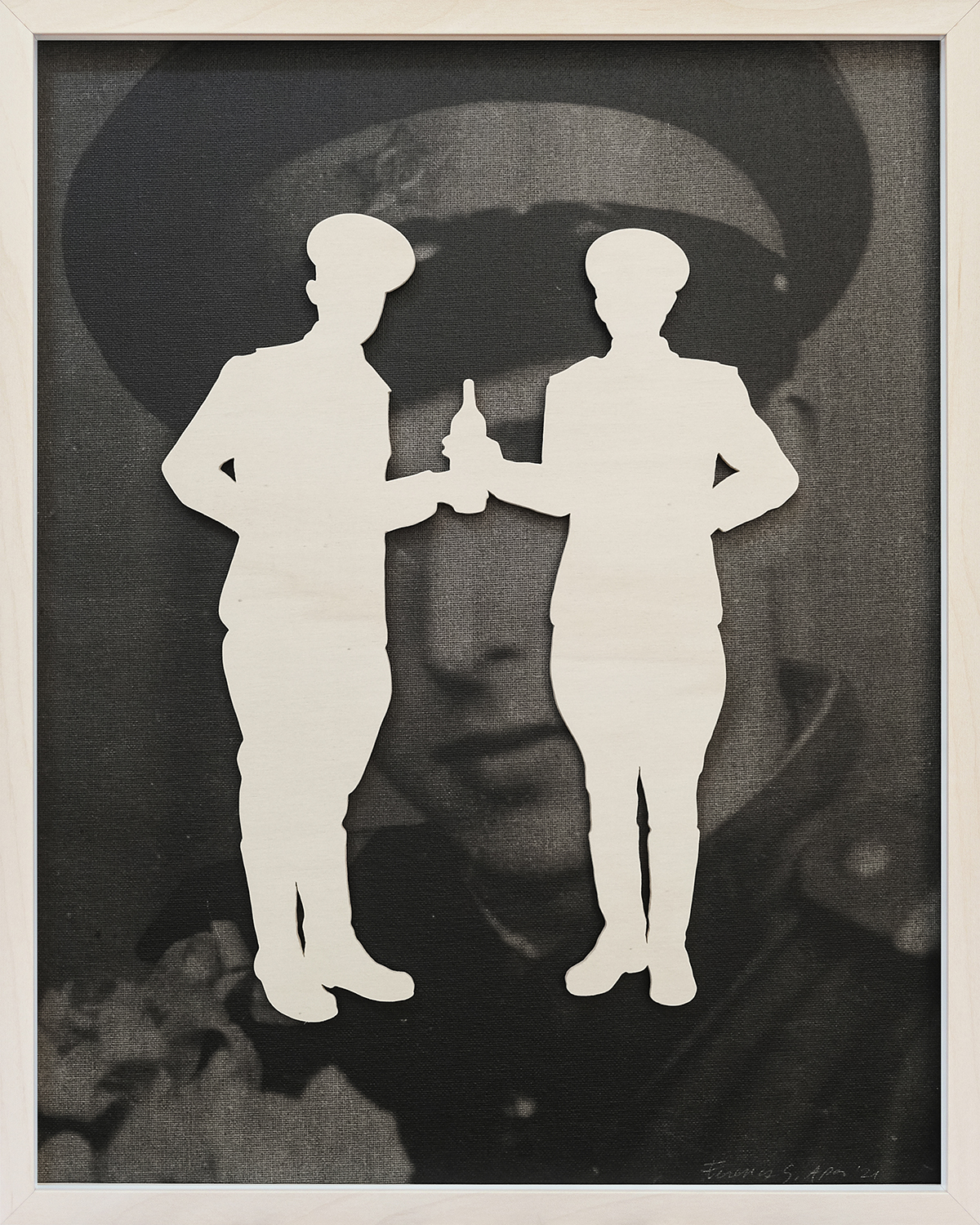 Ferencz S. Apor munkássága egy másik emlékfelidézési típus, szintén az idő múlásával keletkező jelenség, az emlékek elhalványulása révén érhető tetten. A kiállításon látható korábbi, Ismerős jelképek című sorozatának alapját gyermekkorát, a nyolcvanas éveket idéző személyes vonatkozású és talált tablófotók vászonra nyomott, fekete akril lazúrral a tónusokat visszavett, azaz elhalványított fotók képezik. Ezekre a fotókra a technikaórákon akkoriban gyakran használt eszközzel, lombfűrésszel vékony falapból kivágott, mindannyiunk számára ismert jelképeket applikál.