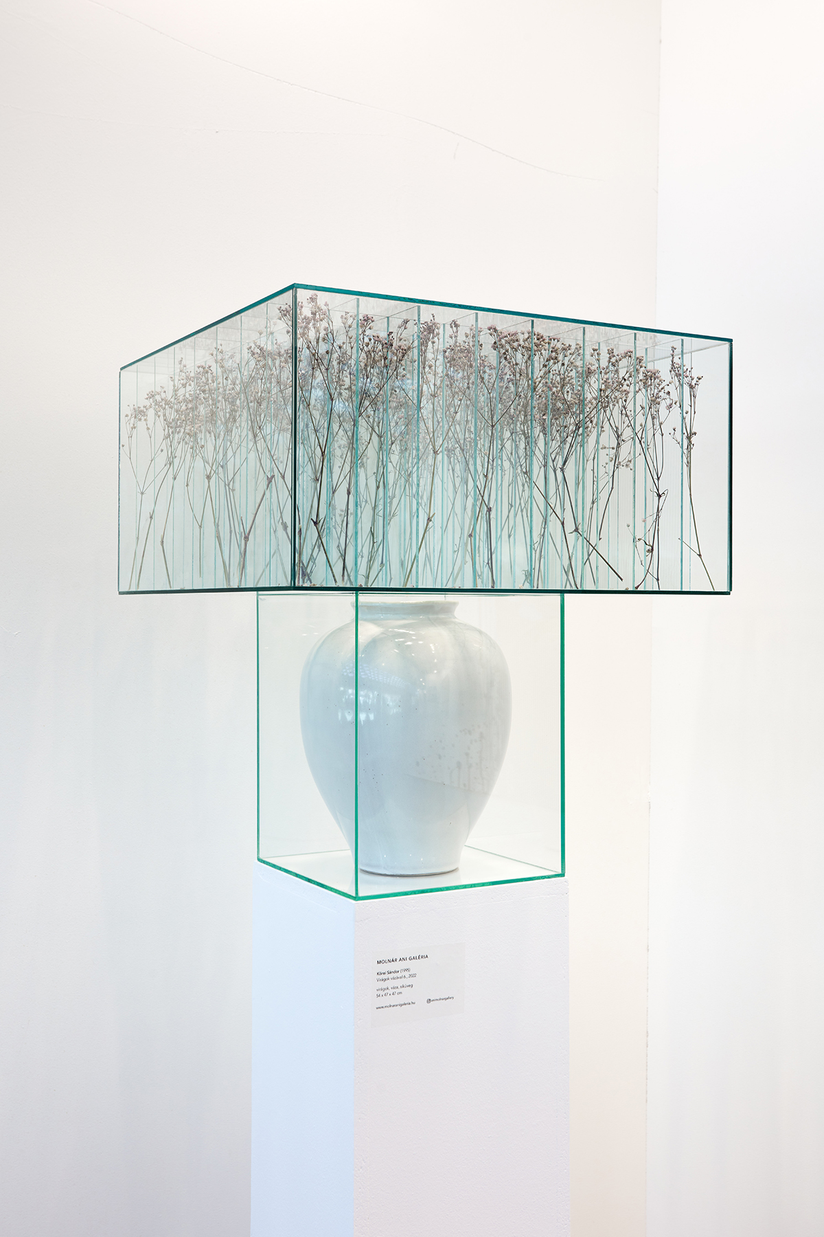 Az üvegbe zárt szerves anyagok éppúgy az élet és a halál ciklusában mozognak, mint bármi más – ez a természetes rend része. Ha egy virágot levágunk, vagy egy lehullott gyümölcsöt meghagyunk a természet útján, akkor azok az organikus anyagok elkezdenek lebomlani. Alkotásaimban az üveg értelmezhető az emberi beavatkozás eszközeként is, mint külső hatás, hogy ezt a folyamatot megállítsa vagy lelassítsa azzal, hogy új ökoszisztémát hoz létre, ahol a változó páratartalom, fény és hőmérséklet uralkodik, befolyásolva a bomlás folyamatát. Ez arra késztet minket, hogy elgondolkodjunk azon, hogyan viszonyulunk a természethez, és hogyan próbáljuk befolyásolni a minket körülvevő világot. Műveimben a száraz növények használata nemcsak a természet mulandóságát, hanem az emberi beavatkozás mértékét is tükrözi. Az alkotásaim a környezetünkre gyakorolt hatásunkat is érzékeltetik, hiszen azzal, hogy kontrollálni próbáljuk a természet rendjét, gyakran elhanyagoljuk annak természetes ciklusait.