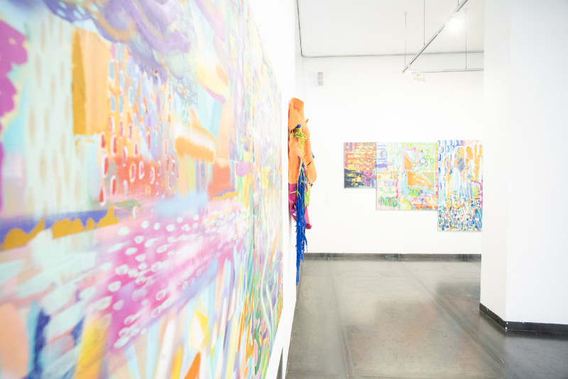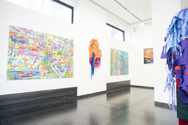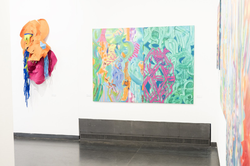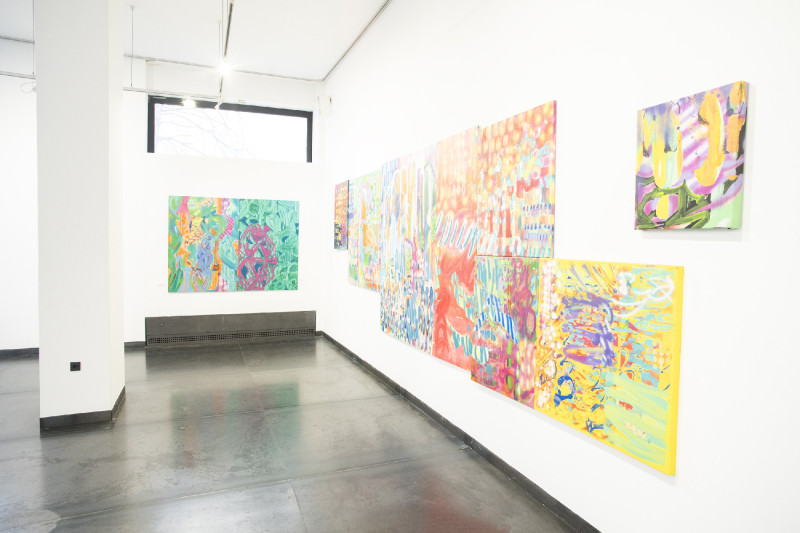 A fújt és a pasztózus festékrétegek állandó párbeszédben vannak egymással. A kompozíciók sűrűk, telítettek, szinte túlcsordulnak – tombol bennük a horror vacui. A képfelület nem sima, hanem nyers, rétegzett, taktilis és eleven. Ettől a festészetnek erős testi jelenléte van: a képek zsigeriek, vibrálnak, nagyon határozott jelenvalóságot hordoznak.