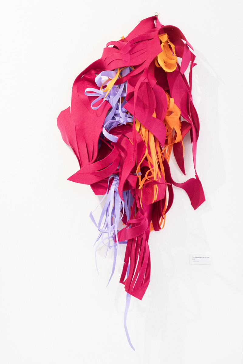 értelmezik a kép és a tér viszonyát. A filcmunkák egyik legizgalmasabb sajátossága groteszk minőségük. Egyszerre taktilisak, puhák és organikus érzeteket keltenek, ami közel hívja a befogadót, miközben lényszerű jelenlétük, árnyékuk és térbeli súlyuk nyugtalanító, szinte fenyegető atmoszférát hoz létre.