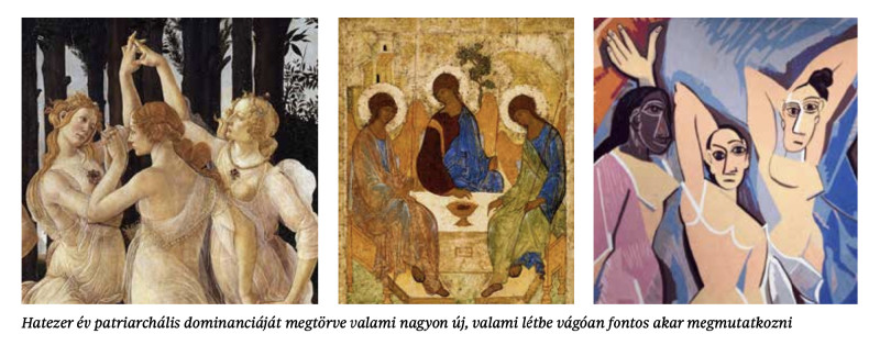Sokat mesél erről a jelenségről, ha – csak vázlatosan is – összehasonlítjuk a festészeti ábrázolás három ikonikus képét. Az egyik valójában is ikon, az ikonok ikonja. Az egyik tehát a Rubljov-ikon, a másik Botticelli Tavasz című képe, a harmadik a modernitás műikonjává emelt Picasso-kép, az Avignoni kisasszonyok. Mindhárom képen „három grácia” áll kitüntetett háromszög viszonyban és a háromszög szakrális jelentésére mutató, szinte nem is leplezett utalással. Mindhárom képen Erósz isteni jelensége tárja fel magát égi, földi és „földalatti” formájában. Mindhármon a nőiség, a nőiségben megfogalmazható emberkép jelenik meg.