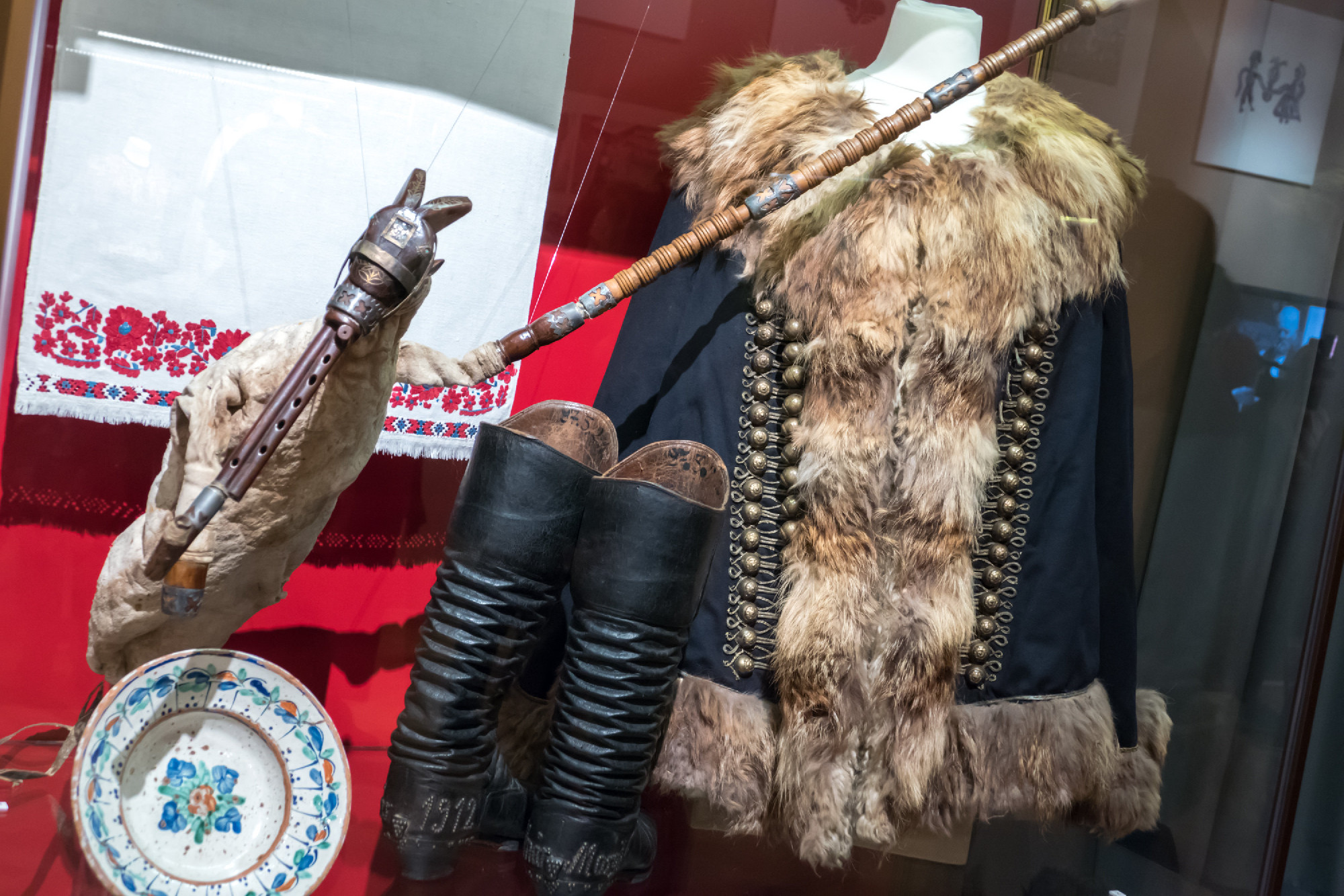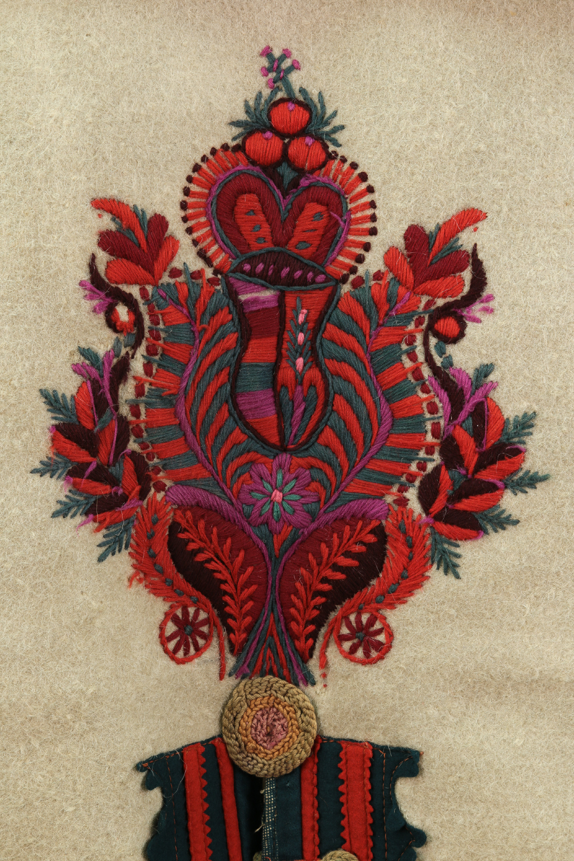 Lassan bezárul a kör, a kiállítás végére érünk. Az egyik vitrinben kis méretű cifraszűr figyel, pontosabban éppen hátat fordít nekünk. Zábrátzky Évának erről is van története.