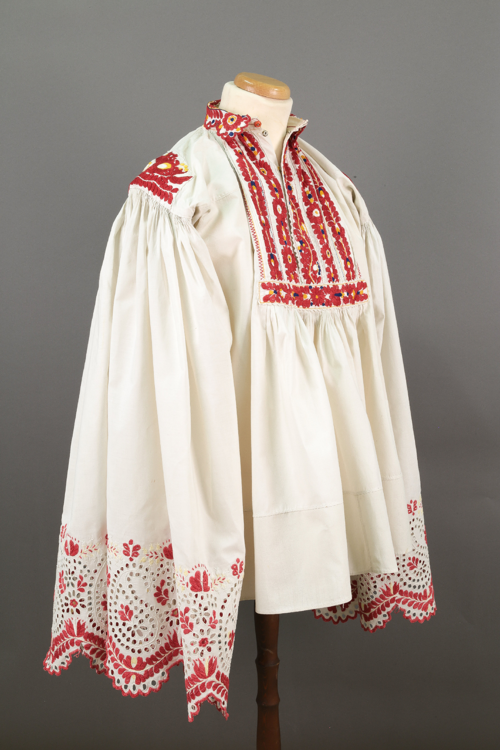 Igen. Trianon után a magyar identitás kifejezéseként a városi otthonokban is megjelentek a népi hímzések és kerámiák. Ebben a korszakban jött divatba a magyaros öltözködés. Kiállításunk egyik kiemelt témája – vezet két álló vitrinhez Császi Irén – a korabeli divatbemutatók. A harmincas években a Nemzetközi Asszonyhét keretében ezeken mutatta be Holló Valéria az eredeti népviseleteket, mellette pedig Zsindelyné Tüdős Klára népművészeten alapuló kollekcióit vonultatta fel. Így próbálták becsempészni a fővárosi polgárok alkalmi öltözködésébe is a népi motívumokat, a magyaros stílust.