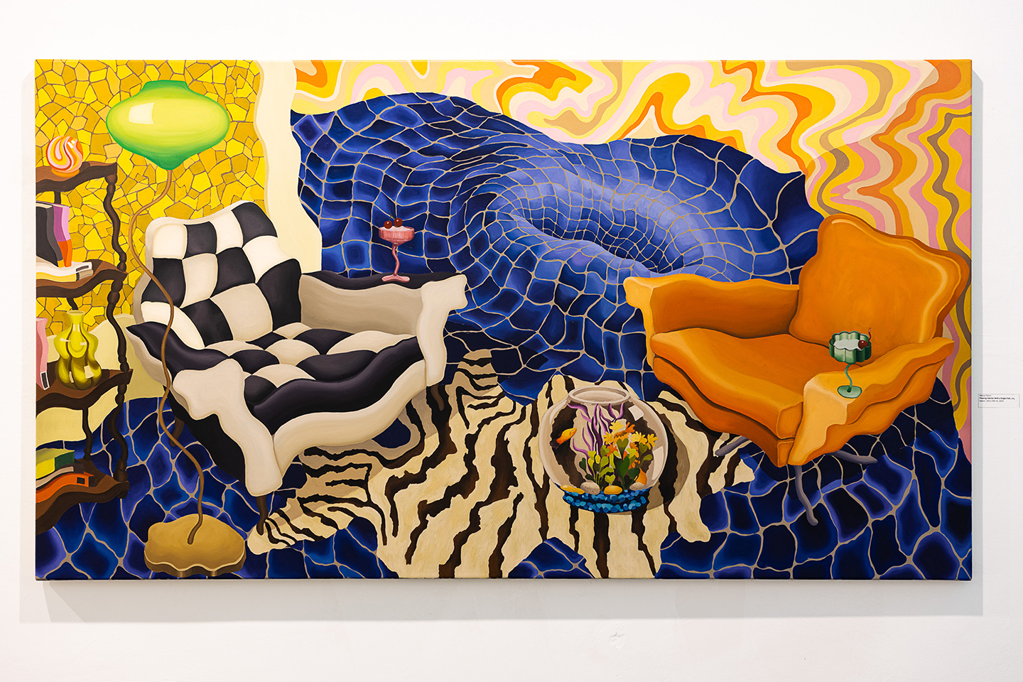 Marosi Panni a Covid alatt kezdte el festeni ezeket az enteriőrjeit, amelyeknek hátterében gyakran fiktív, tágas táj felé nyílik ki a képtér. Bent és kint érdekes dinamikát alkot, mert míg a valós enteriőr a kilencvenes évek jellemző tárgykultúrájából építkezve a nosztalgia érzését ébreszti fel a befogadóban és a bezártság metaforájaként működik, addig a fiktív táj az elvágyódás és a képzelet tágasságának szimbólumaként olvasható. A közel és a távol ezen játéka szintén feszültséget teremt a kép terén belül.