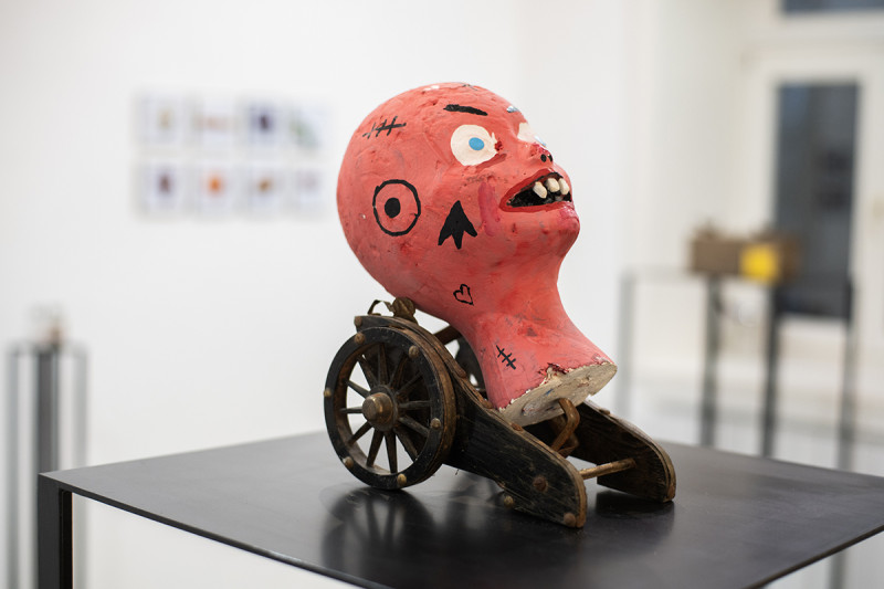 A H air-brush nem szenved hiányt sem fantáziában, sem komikumban, az ecsetnyelek ugyanis túlontúl vékony nyakként vezetődnek bele a fejekbe. Vicces, de inkább ijesztő Stark Attila Rózsaszín fej (2018) című műve, egy ágyútalpba rögzített groteszk fej. De megrökönyödést válthat ki a falra applikált tehénfej Szöllősi Gézától vagy Hack Ferenc kekszekből alkotott Háziasszony (2021) című műve is.