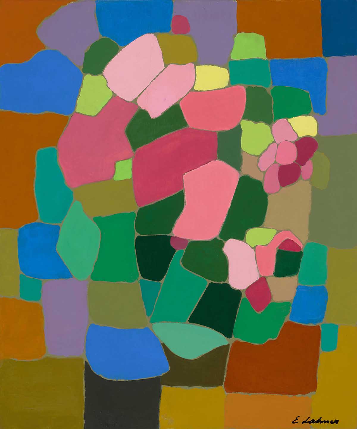 Kiállított képei olyan művész kísérletei, aki sem a geometrikus szerkesztés szabályrendszerében, sem az expresszív gesztusokban nem találta meg magát. A természetes színek homogén mezői lágyan illeszkednek egymás mellé, ahogy a templomi üvegablakok színei, amelyek átengedik a fényt, de feloldják, elhomályosítják a mögöttük lévő valóság formáit. Nem feszíti indulat Lahner absztrakcióit. Ha van is kontúrvonalhoz hasonló grafikai megoldás a vásznon, az leköveti a foltok kompozícióját. A képek mérete és színharmóniája is időtlen merengést, egyfajta absztrakt csendélet-hatást hoz létre.