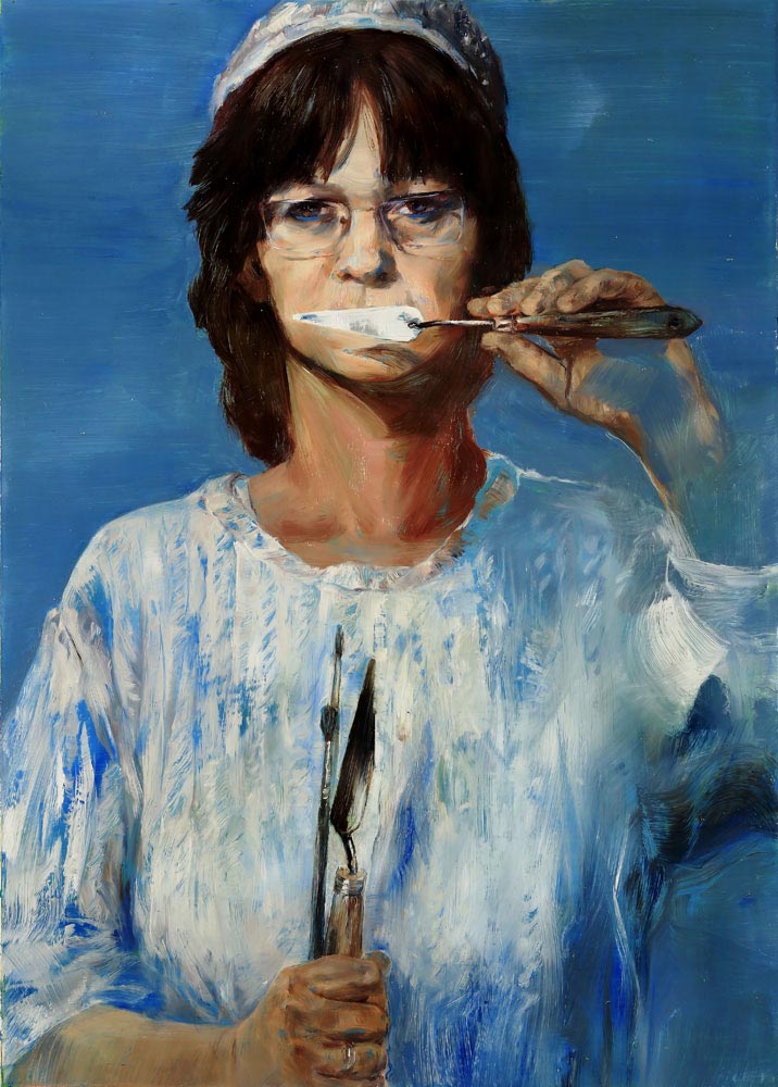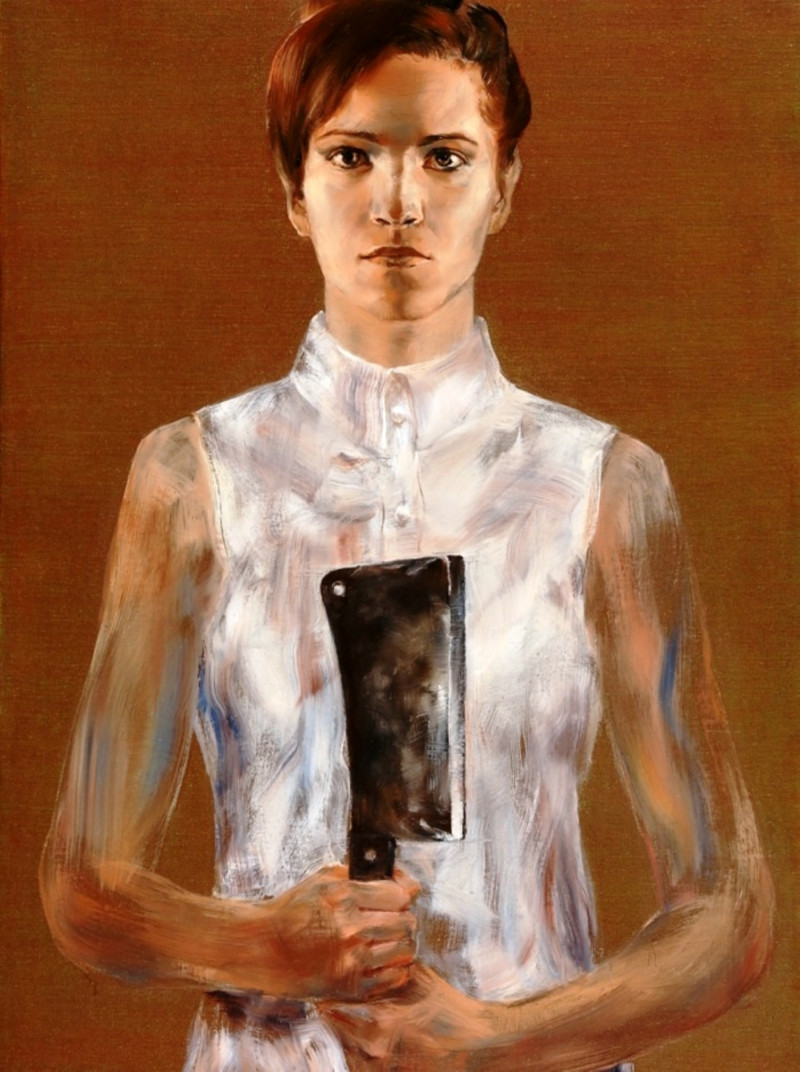 •A Szembesítés című, 2014-ben festett sorozatodban újra hangsúlyosabbak lettek a narratív tartalmak. A félalakos portrékon a fiatal és szép, fehér ruhás nők kezében bárd, piszkavas vagy machete. Az egyetlen kivétel egy önarckép, amelyen a szúró-vágó fegyvereket festőkés (spachtli) helyettesíti. A gyönyörűen megfestett képeket nézve megfogalmazódik a probléma: a nők kiszolgáltatott helyzete egy férfiak által uralt társadalomban – és persze a művészeti életben.