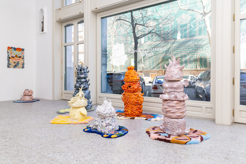 A fali objekteket nagyméretű, modulárisan építkező, amorf szobrok egészítik ki, amelyek szintén kifejezetten erre a kiállításra készültek. Ezekben is jelen van a sokféle minőség: puha szőnyegen álló, szörnyszerű lényeknek látjuk őket, akik amorfan szétfolynak, kontúrjaik sem szilárdak vagy konkrétak, ez a fajta képlékenység pedig szintén a testiséget és a testszerűséget emeli a befogadásba, zsigeri érzeteink támadnak, ugyanakkor olyan nem emberi létformákra asszociálunk, mint a korallok vagy a polipok.
