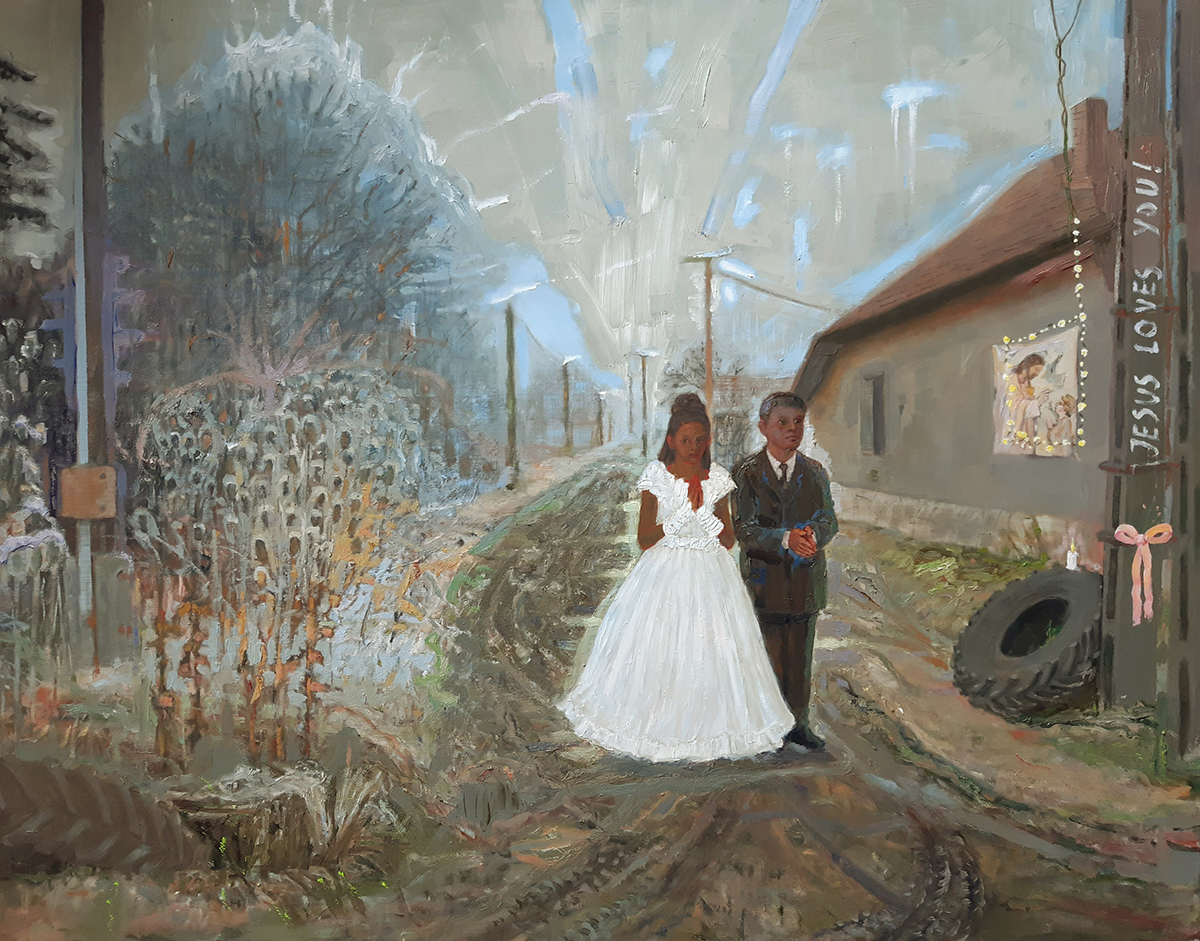A festő érdeklődése köztudottan sokrétű, a földi dolgokon kívül az örökkévalóságra és az elmúlásra is kiterjed. Vallásos képeinek egyik kiemelt tárgya a többször is megfestett elsőáldozás. Ilyen tárgyú első műve jó tizenöt esztendővel ezelőtt készült. A mostani kiállításon két alkotás ismét foglalkozik a témával. Az Elsőáldozók II. (2020) címűn egy fehér ruhás lány és egy öltönyt, nyakkendőt viselő fiú bandukol egymás mellett a sáros úton. A főszereplők azonban nem ők, hanem az elhanyagolt környezet, az utca, melynek egyik oldalán Jesus loves you! feliratos, masnival díszített villanypózna magasodik, melyhez elhasznált traktorgumit támasztottak,