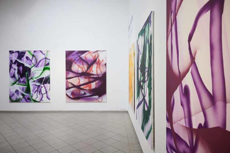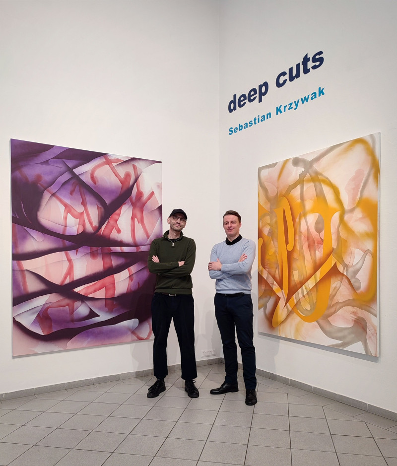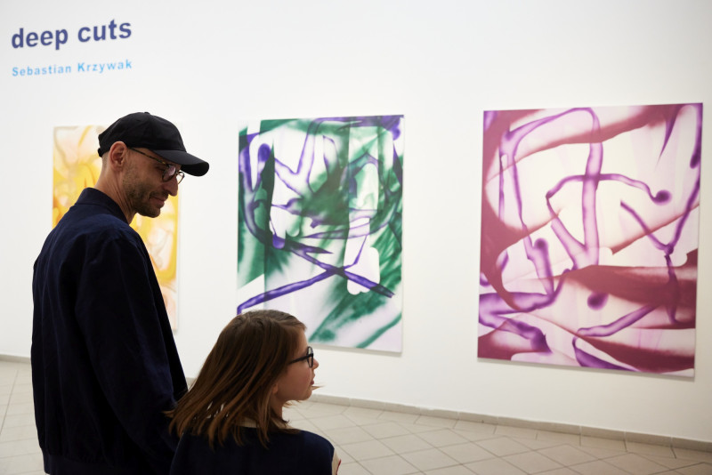 A Lengyel Intézetben most látható kiállítás címe Deep cuts, mely Krzywak 2023 és 2025 között készült festményeit mutatja be. A címadó kifejezés többféleképpen értelmezhető, egyrészt utal a formák elsődleges megjelenéseire, a festészet fizikai gesztusaira, másfelől a festmények rejtett, gyakran ellentmondásokkal teli lírai tartalmaira, melyek a mélyrétegekből olvashatók ki. A cím jelentése a zenei világban is ismert, a lemezek B oldalának rejtett minőségi kincseit jelöli, ahol az előadók kevésbé ismert dalainak mélységei kerülnek fókuszba, illetve ahol az alkotók kísérletező szándéka válik fontossá. Krzywak csak teljes sorozatának ad címet, egyes munkáit azok nélkül hagyja, hogy velük a recepció szabadságát ne befolyásolja.