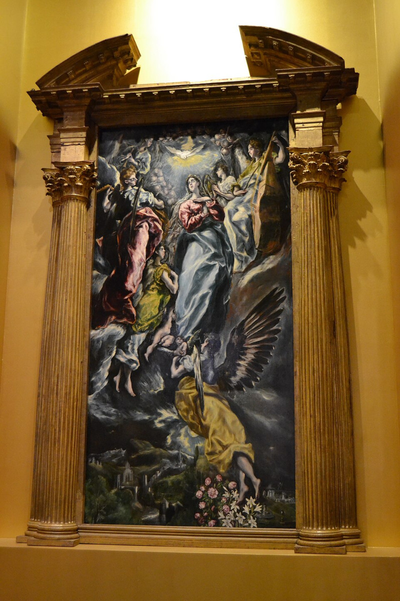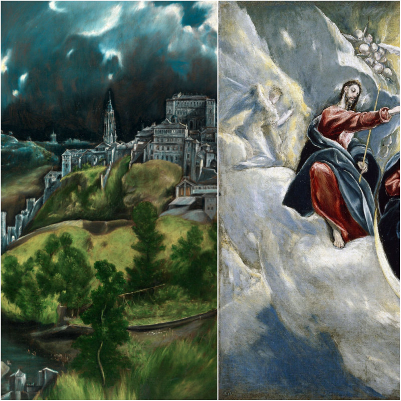 El Greco elliptikusan elnyújtott, fáklyaként lobogó alakjai sajátos módon formálják át a valóságot, ám talán még érdekesebb, amikor zabolátlan festői képzelete terra-formálódik a valóság által. Legzseniálisabb módon A Szűzanya megkoronázása című oltárképvariációk legsikerültebb változatán. Nem annyira a lángnyelvként lobogó egzaltált alakokon, mint a képet uraló ellipsziseken, melyek mintha a kortárs Kepler kozmikus törvényét visszhangoznák, különösen Mária arcán és koronáján, a Szentlélek galambsziluettjén, Jézus jobbján és ruhaujjain, míg a mennyei fellegvár szinuszgörbére emlékeztető végtelen vonalai e szereplők mozdulataiban folytatódnak és vice versa, legszebben talán annak a holdsarlónak aranyba hajló ezüst ívén, melyen Mária trónol, mint matriarchális anyaistennő vagy a pogányok legyőzője. El Greco térrendezése e fellegvárban éri el tetőpontját, hiszen lényegében saját leghíresebb tájképét imitálja a viharos toledói tajról, ám nem a képen látható sötét viharfelhőt, hanem a dombok hullámzó lankáit, melyekre szinte élő organizmusként kúsznak az épületek. El Greco tehát Toledo mintájára terra-formálta képzeletét, hogy megalkossa e mennyei fellegvárat. Mindez akkor is működne, ha az alkotói szándék tudattalan. Ám A Szeplőtelen fogantatás című oltárkép az alkotói szándék teljes tudatosságát jelzi, mivel ezen e két motívum együtt jelenik meg: a viharos toledói táj és felette a lángnyelvként lebegő Szűz az átformált fellegvárral.
