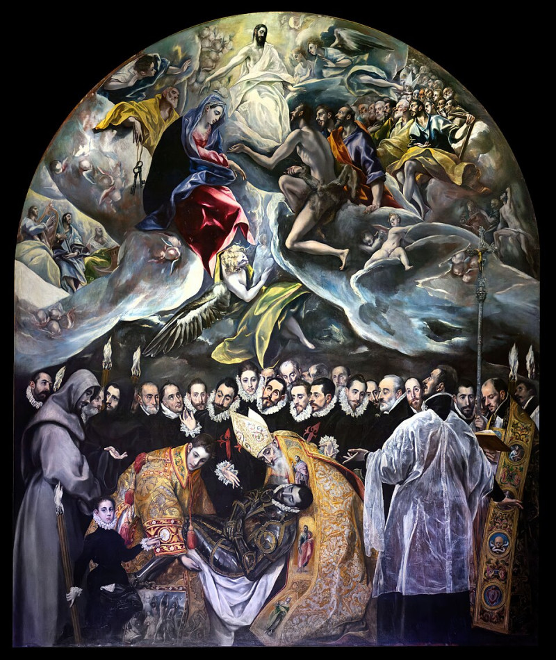 El Greco Görögországban született, festeni Itáliában tanult a velencei koloristáktól, talán Tiziano műhelyében, annak segédjeként. Példaképének Tintorettót tekintette, és állítólag elutasította Michelangelót, mint „középszerű koloristát”, holott még az eredeti, ragyogó opálszínekben láthatta a Sixtus-kápolna mennyezetét. Az itáliai tanulóévek után Madridba került, II. Fülöp udvarába, ám a műértő király kegyeit nem nyerte el, ezért végül Toledo városában horgonyzott le, ahol – bár életéről keveset tudunk – fényűző életet élő, kölönc zseni hírében állt, amit tetemes adósságlevelei igazolnak. Két területen alkotott igazán maradandót. Arcképeiből olyan érzelmi erő árad, amit csak Rembrandt- és Van Gogh-portrékkal érdemes összevetni, míg mozgalmas oltárképei szinte szürreális hatásúak. Az Orgaz grófjának temetése olyan népszerű opus magnum, melyen festőnk mindkét területen legjobb formáját hozza.