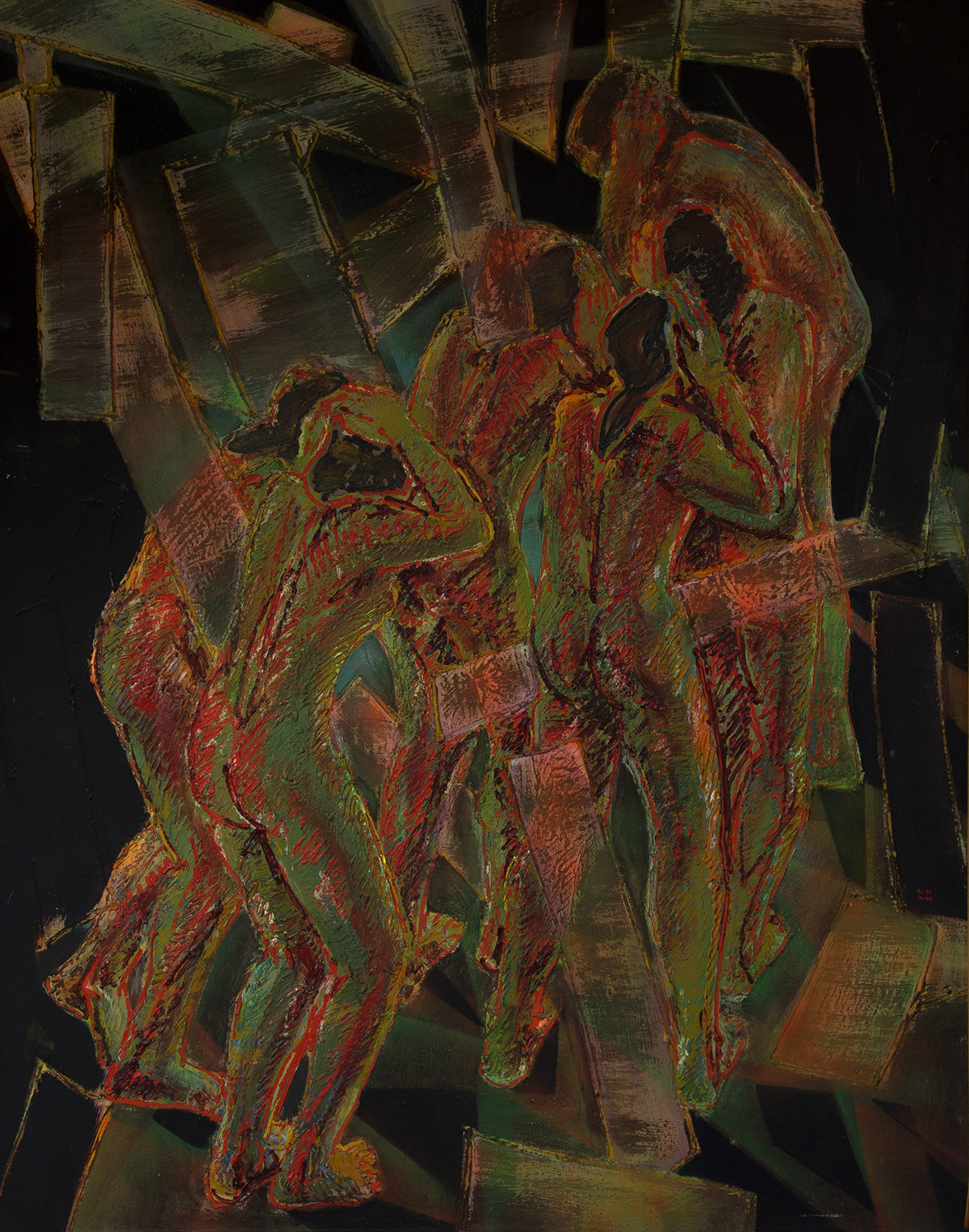 Érdemes az ötvenöt festményt bemutató, pályaösszegző kiállítást az útkereséstől az Tenk összetéveszthetetlen forma- és színvilágáig, a sajátosan mélabús, mégis valami bölcs derűt rejtő stílus megtalálásáig és annak kiteljesedéséig végignézni. A művészt pályakezdő évei Debrecenhez kötötték: a Nagyerdei Művésztelepen élt és alkotott 1970 és 1975 között. 1975-ben Budapestre költözött, azóta is ott él. Fiatal festőként a kísérletezés, a dinamikus életérzés visszaadása foglalkoztatta. Korai festményein nyers színek, olajzöldek, izzó vörösek, narancsok dominálnak. Ekkoriban kizárólag a figura érdekelte, legyen az önábrázolás alkotás közben (Önarckép 1973; Kint és bent 1978), a békésen alvó várandós hitves (Várandós alvó, 1970), vagy az akkor alakult győri balett modern táncosainak együttes mozgása, ami elementárisan hatott rá (Elűzöttek 1978).