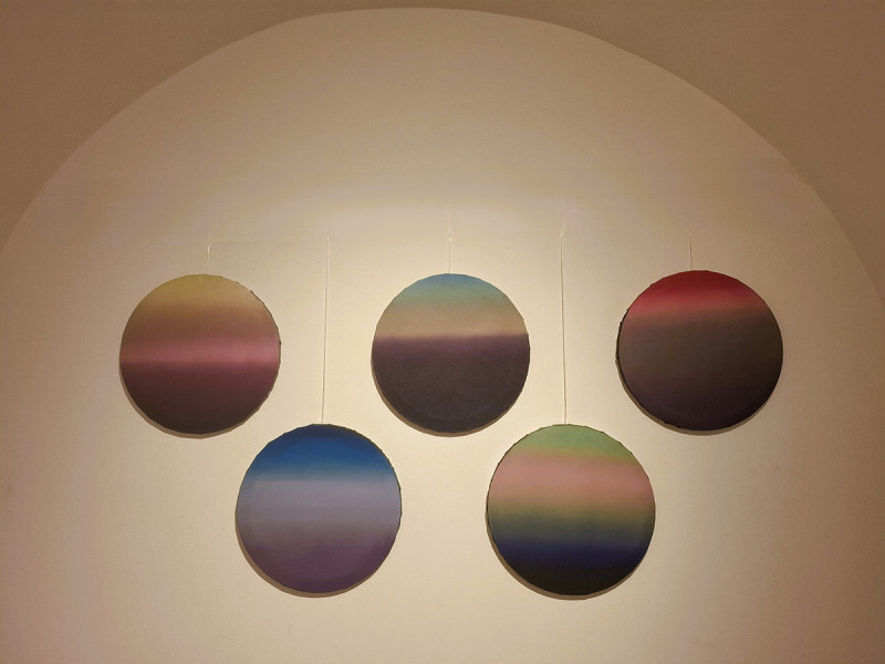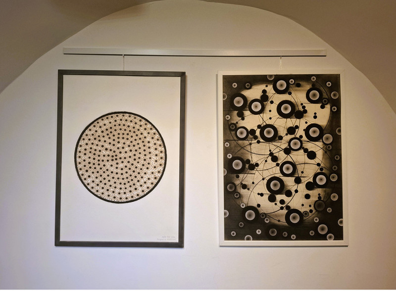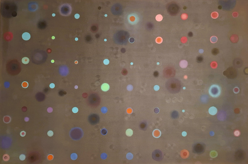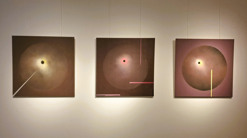 Sebők Éva a kétezres évek elejétől alkalmazza a most is látható pöttyös, körformával kifejezett fényforrások tértagoló látványvilágát. Korábbi monochrome, inkább a csíkok dominálta olajképeiből jelen kiállítás főfalán láthatunk példát (Éjszakai utazás, 2024). A fényvonulatok közt felvillanó fényesség akár ősrobbanás érzetét keltheti. Hirtelen, amikor ezt a munkát a műteremben megmutatta nekem, a változó intenzitású fénycsíkok pixelességéről a nyolcvanas évek kezdeti számítógépes játékai jutottak eszembe – legfőképpen a Pac-Man. Ahogy a világos figura egyre csak eszi az egyre sűrűbben, egyre hosszabb formában elé kerülő sötétséget, amitől önmaga egyre életerősebbé válik. Pedig Sebők Évát nem gondoltam a korai számítógépek barátjának – de játékossága alapján mégis ez a kép formálódott meg előttem.