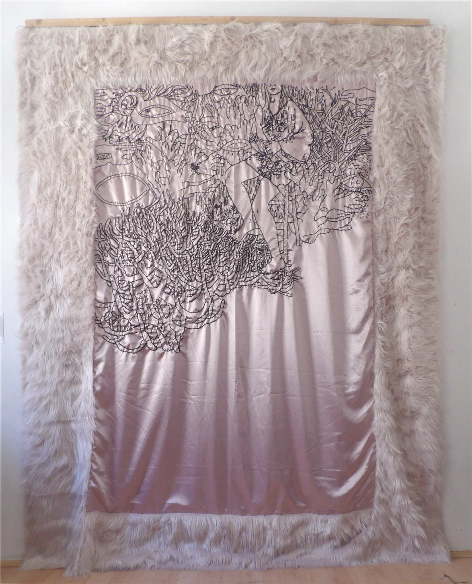 E textilmunkák különlegességét adja az is, hogy különféle installatív szituációkba helyezve teljesen más jelentésüket vagy minőségüket lehet kidomborítani. Falra téve a táblaképszerűségük erősödik fel, míg a térbe függesztve függönyként hatnak, amiben ott van az elrejtés misztikuma is. „A felszín mögötti valóságot eltakaró lepel személyes lelki életünk újraértékeléséhez kapcsolódó vallási és filozófiai irányzatokra tett utalás.” Ezek a művek egy paravánra feldobva is egészen más hatást keltenek, sőt: az alkotó a szivacs használatával még inkább képes árnyalni e művek jellegét. Szivacs nélkül lágy esése van ezeknek a munkáknak, függönyszerűségük, légiességük dominál, ha szivacs kerül mögéjük, akkor pedig merevebbé válnak, jobban emlékeztetnek a takarókra, melegségérzetet közvetítenek. Ezek a művek ősszel több helyen is láthatók lesznek, a művész jelenleg a novemberben nyíló nagy hármas kiállításra készül Gallai Judit Ágnessel és Wirth Abigéllell, amelyet a Godot Intézet tereiben rendeznek meg.