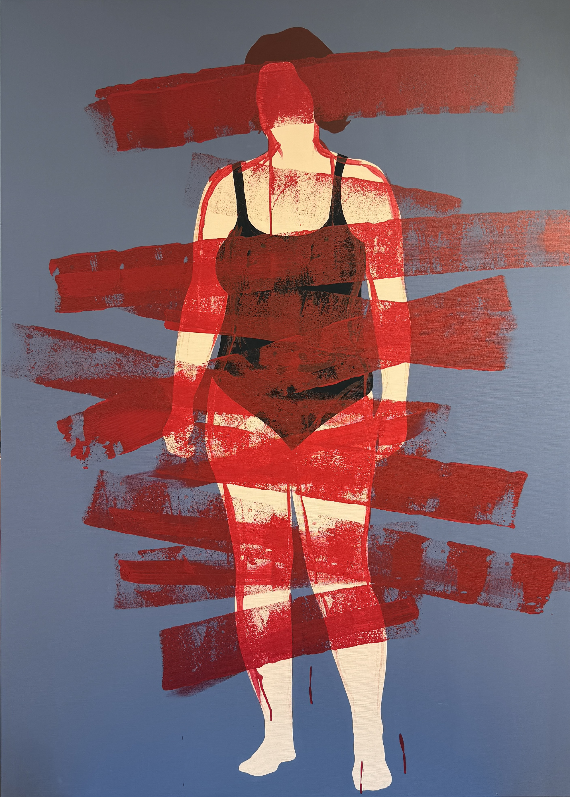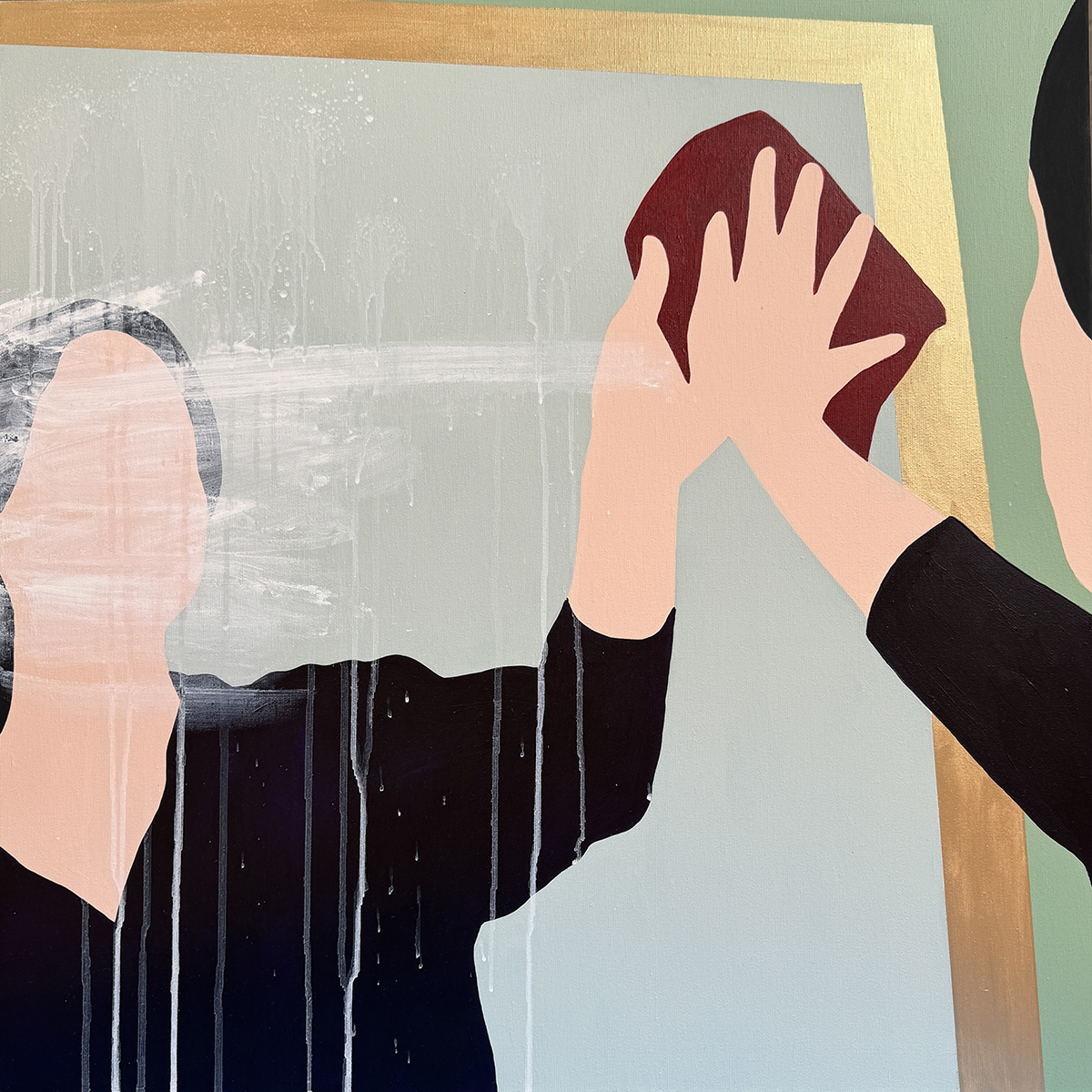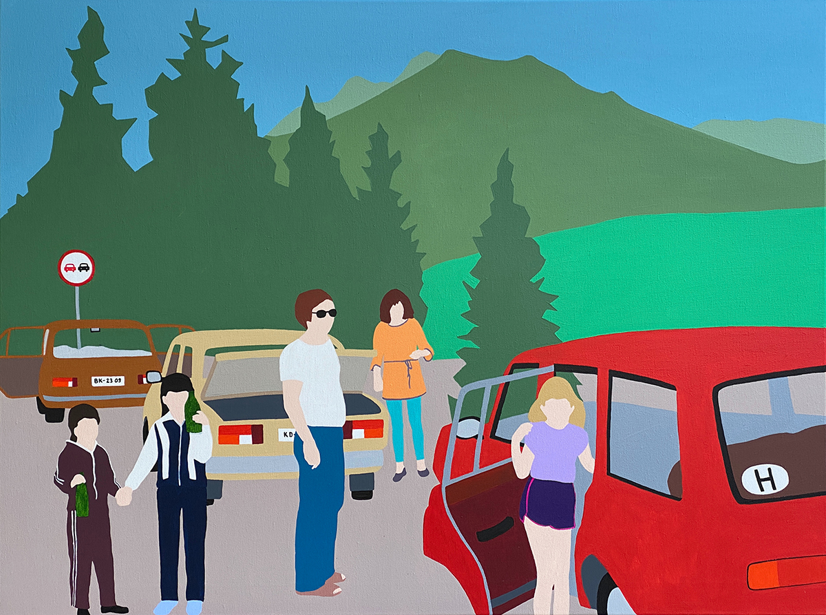 „Azt éreztem, hogy szeretném kibillenteni a képeimet az eddigi statikusságból. Első lendületből, egymással párhuzamosan három festmény elkészült már, de még a folyamat elején vagyok. Úgy szeretném megtartani a képeimre jellemtő letisztultságot és homogenitást, hogy ütköztetem gesztusszerű, spontán megoldásokkal. Tehát továbbra is a fotó alapján inspirálódott, az előre megrajzolt kompozíciókat tartom meg, de kiegészítem olyan eljárásmóddal, amely dinamikát visz a képekbe. Közben pedig arra törekszem, hogy ezek ne csupán technikai elemek legyenek, hanem a festmény üzenetéhez is hozzá tegyenek valamit.”