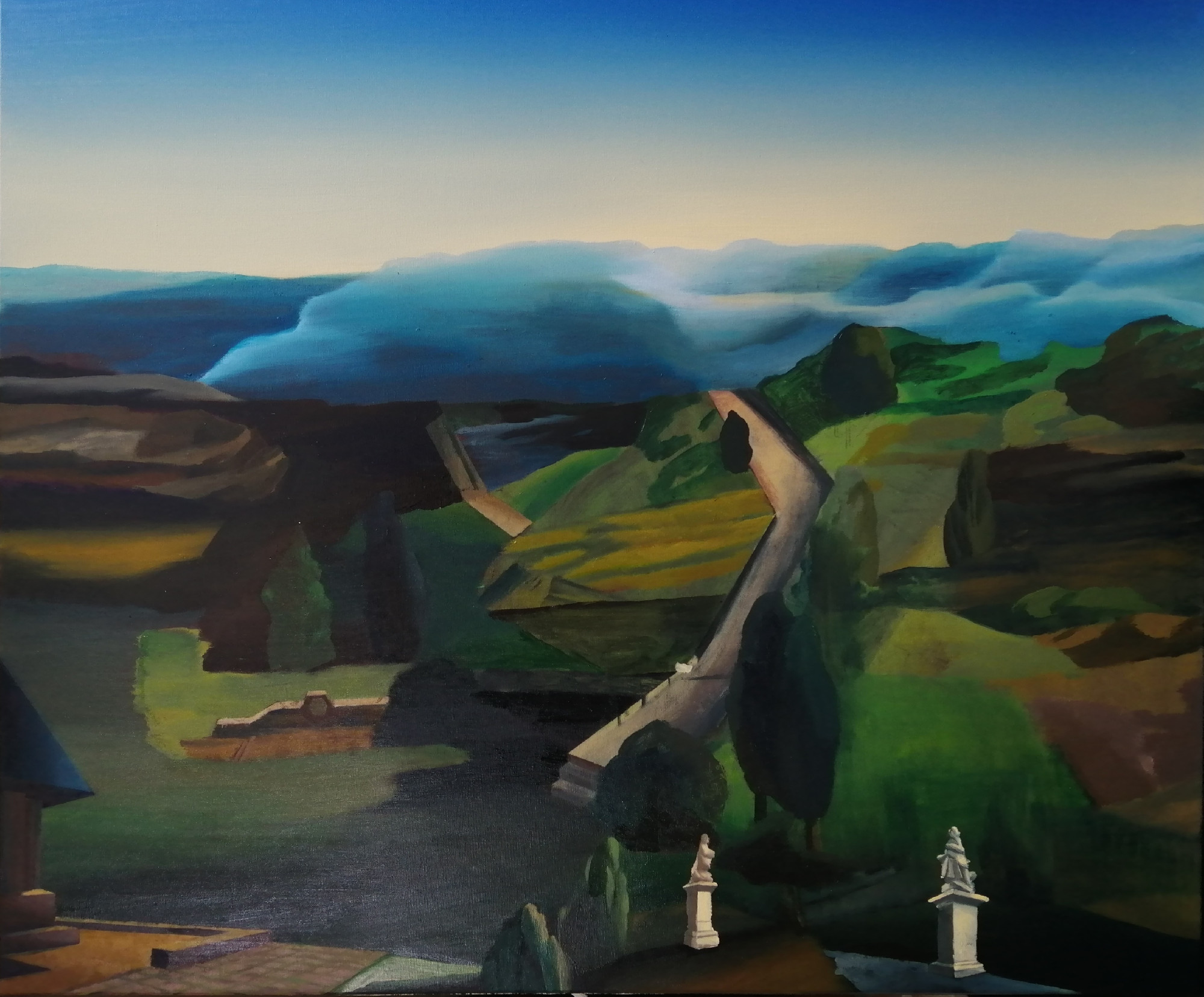A kompozícióiban tehát érzékelhető a nagy, egyetemes, időtlen létező, ami mellett eltörpülnek az egyéni életek. Az archaizáló épületek egyfajta képi eszközei a permanensen jelen lévő energiának: az ornamensek rögzítik és őrzik a múló idő hatásait. Az ábrázolt természeti elemek, a lombos fák, üde zöldekkel a pillanatnyiság tünékenységét elevenítik meg. Ebben a disszonanciában egyszerre van jelen az örökkévaló és a múlékony minőség.