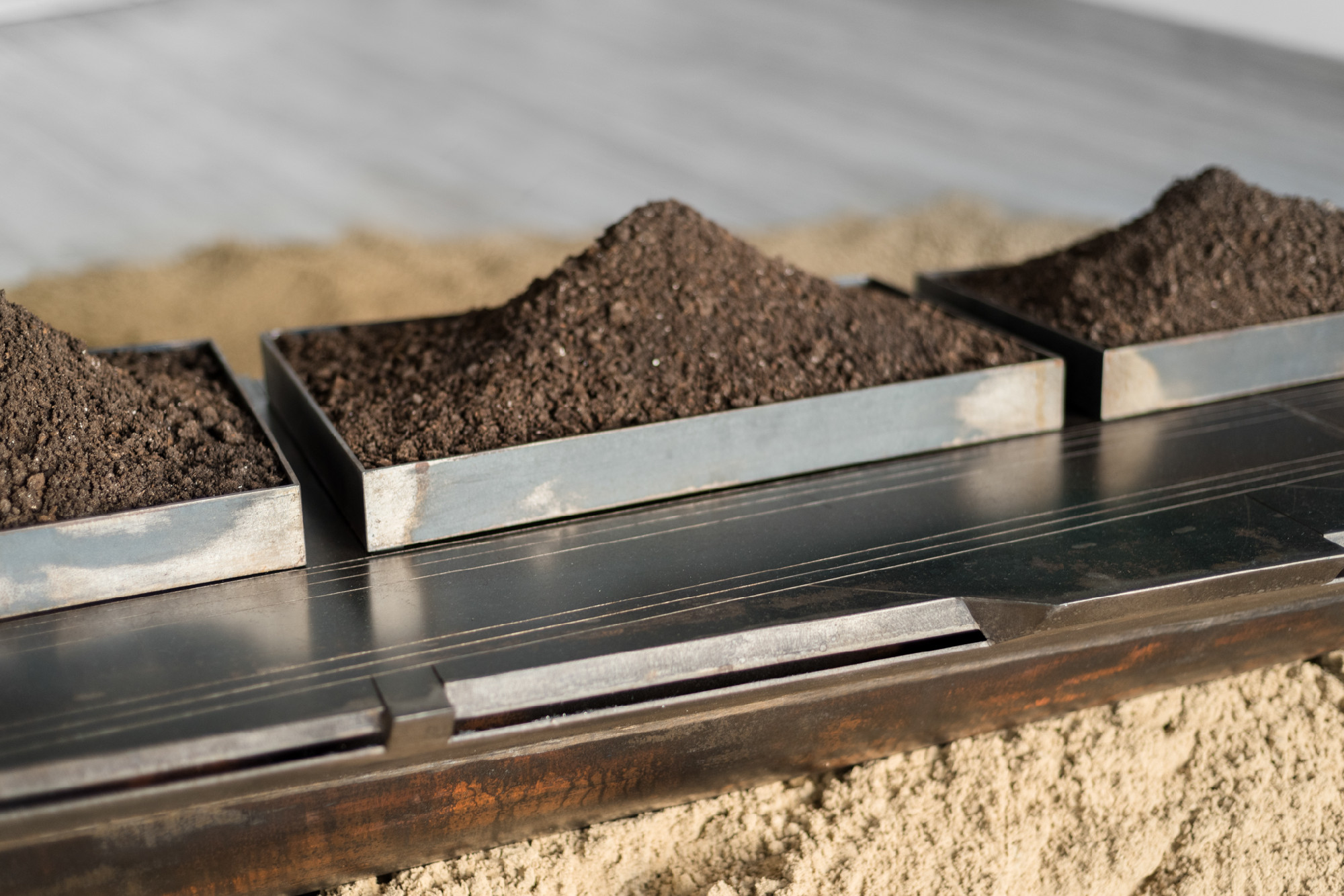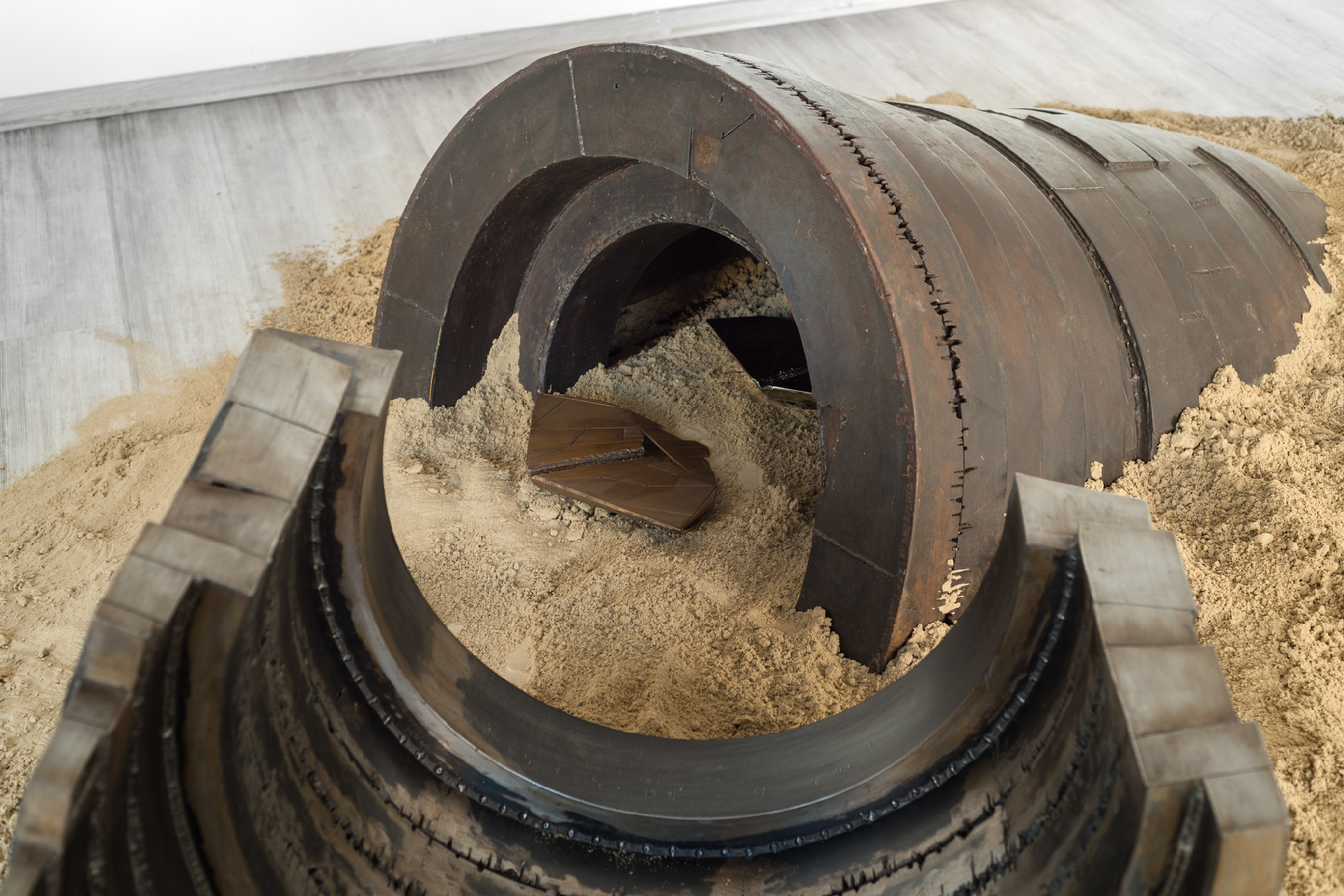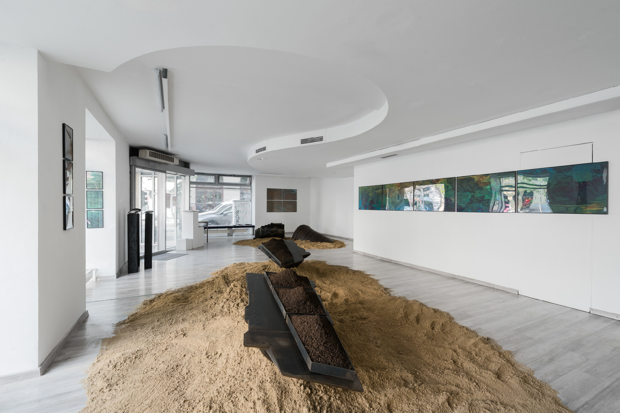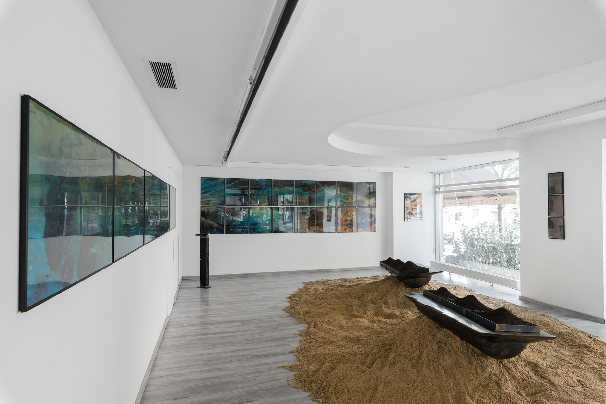 Robusztus, földre helyezett, homokkal körbeölelt, súlyos fémszobrokat falakon látható, könnyed, frízszerűen összeálló akvarellsorozatok egészítenek ki. Két különböző műfajt és anyagminőséget jelenítenek meg Magyari Balázs alkotásai.