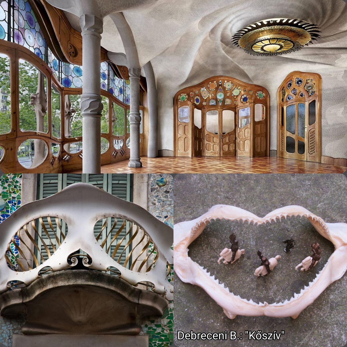 Gaudíra jelentős hatást gyakorolt a mór és a gótikus építészet, illetőleg minden szakrális jellegű, „primitív” építészeti stílus, ám legfőbb ihletforrása a természet volt. Szinte sohasem használt egyenes vonalat, mivel az építészet alapját képező síkidomok szerinte sehol sem fordulnak elő a természetben. A Csontok Háza alapvetően szecessziós stílusban készült, csodás csempékkel és mézes-mázas kerámiákkal ékesítve. Minden bútorát és berendezési tárgyát Gaudí tervezte, de még véletlenül sem a középkori csonttemplomok vagy ókori katakombák komor hangulatát kívánta velük visszaadni, mint később például H. R. Giger. A híres homlokzaton színpompás vízililiomokat látunk Monet stílusában, ám szinte észre sem vesszük őket a „csontok” között. A főkapu ugyanis dinoszauruszcsontvázra emlékeztet, az épület tetején pedig valamiféle mesebeli hüllő trónol, így az épületnek valódi „gerince” van. Ám legzseniálisabbak az ablakok erkélyei: mindegyik egy-egy vicsorgó cápafogsor. A Moby Dick lapjain – Gaudí nem ismerhette – egy bálnacsontvázban berendezett templomról olvashatunk, ám mivel cápafogakra vonatkozó művészi analógiát ezúttal nem találtam, így saját magam készítettem egy telefonos képet erről az érdekes képződményről. Az általam megörökített szívalakú fogsor ambivalens szerelmi hangulatot hívott elő bennem, amit különféle háttértextúrákkal kombináltam, így jutottam el a végleges Kőszív című képig. Amatőr próbálkozásom főhajtás kíván lenni Gaudí emléke előtt. – Így hatott rám a Csontok Háza.