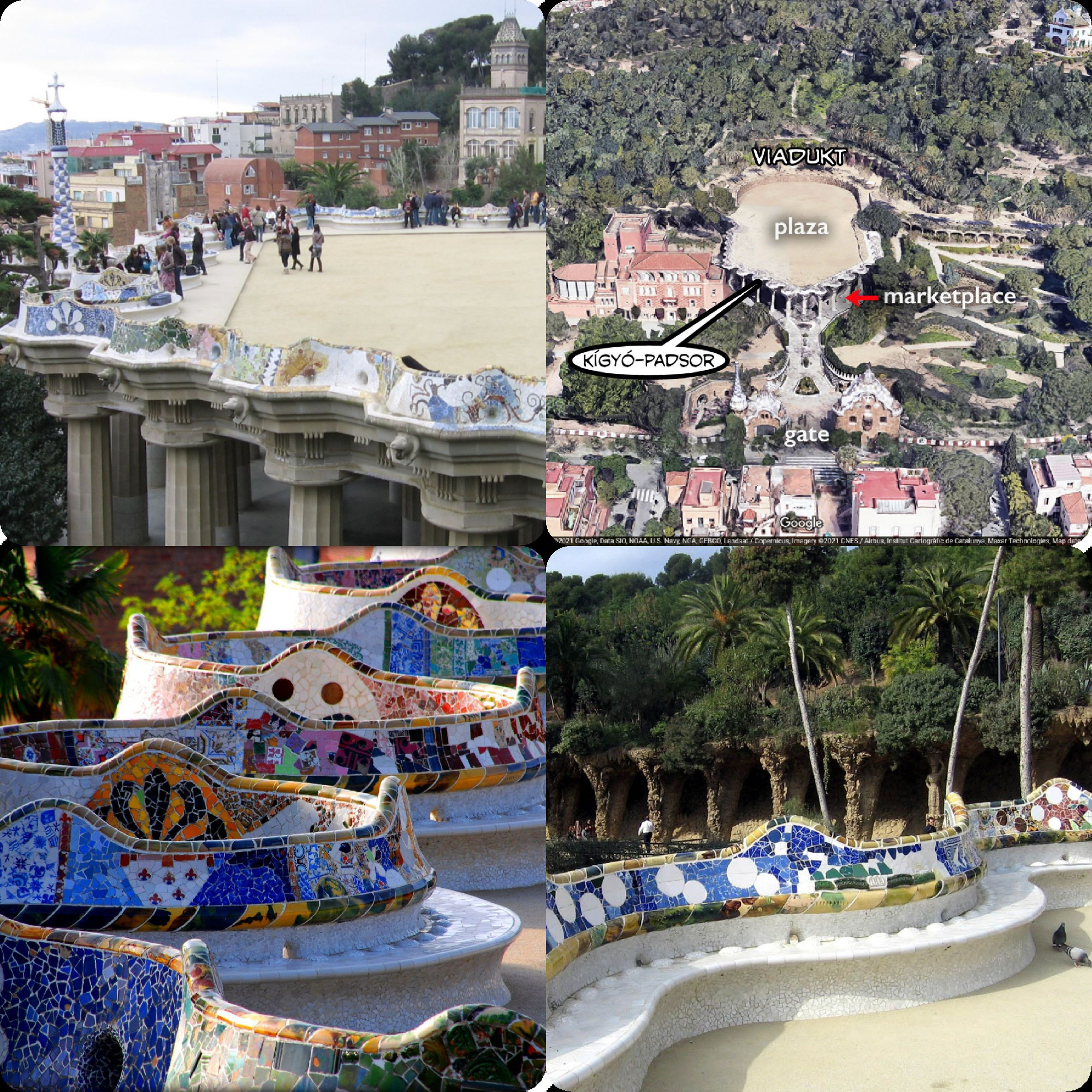 A központi épület – a Piactér – olyan, akár az athéni Akropolisz: csupa hófehér lépcső és márványoszlop; ebben fekszik a rejtélyes belső szentély, a katalán katolicizmusé, ám Gaudí valódi hívei – a Güell park turistái és madarai – a templom teraszán gyűlnek össze, egy Plázának nevezett hatalmas, üres téren, amely olyasmi, mint a rizsporral behintett buddhista japán kertek: meditáció a sűrűségről és az ürességről. Ennek egyetlen ékessége egy soha véget nem érő padsor, egy hatalmas, színes kígyónyaklánc csupa színpompás mozaikból, amely a Piactér párkánya is, feloldva annak szögletes vonalait, s amely lehetne akár a kínai nagy fal ikertestvére is, egy „kicsi sárkány”, hiszen az árkon-bokron átnyúló kínai nagy fal szintén multifunkcionális módon látta el a falak, az őrtornyok és a falakon átfutó úthálózatok feladatát. E kígyó-padsor-párkányzat-nyakék úgy fest, mint Gaudí kacskaringós „szignója” legfőbb művén, amely átöleli az egész Plázát, végül levedli magáról mézes-mázas bőrét és viaduktként a Güell park végtelen zöldjébe kúszik.