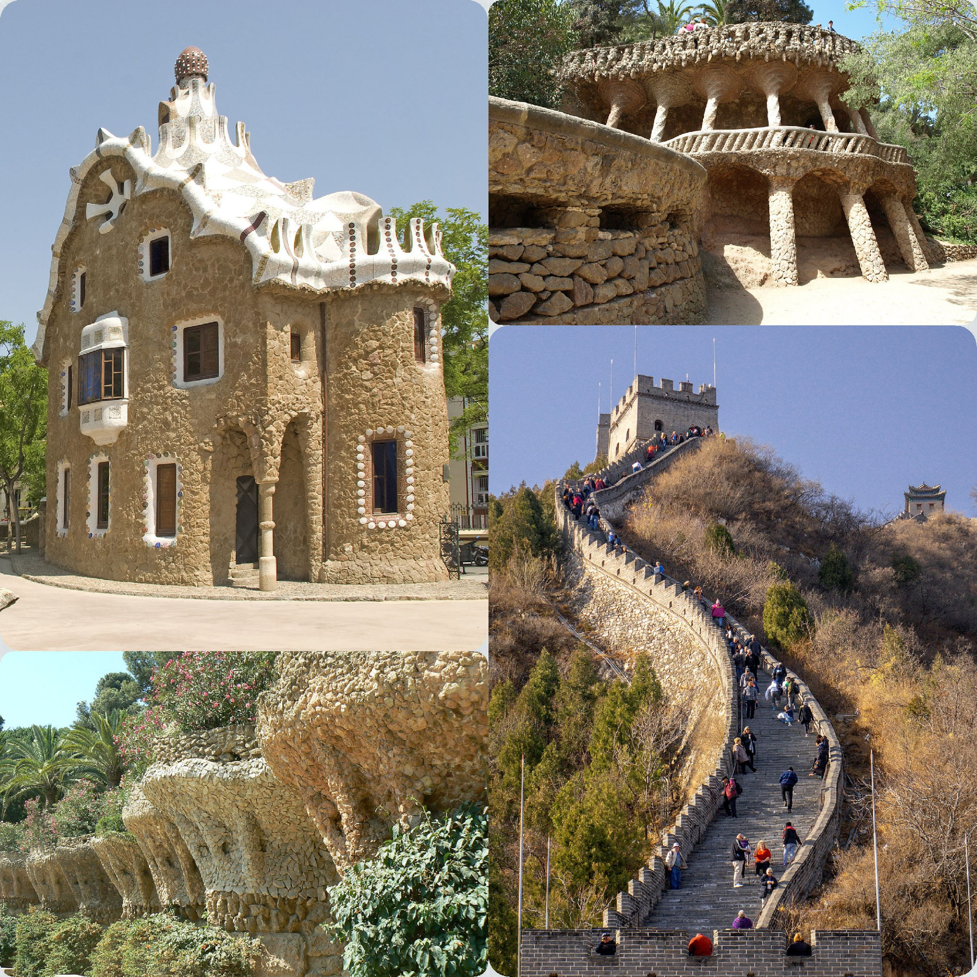A Güell parkban sétálva olyan érzésünk támad, mintha Szemiramisz elveszett Függőkertjében járnánk: a nyers termésköveknek hála teljesen elmosódik a természetes és a mesterséges környezet közti határvonal. Gaudí szabadon merített a különféle korszakok építészeti stílusából. A két bejárati kapu egy-egy kápolnának tűnik, hiszen a park egyfajta szakrális tér. Mindkettő kőből készült, de textúrájuk olyan, mintha fából alkották volna. A számos viadukt szerény és leleményes főhajtás a római építészet előtt, míg a teraszokra formai szempontból jelentős hatással lehettek a reneszánsz kertek és a szabadkőműves grották.