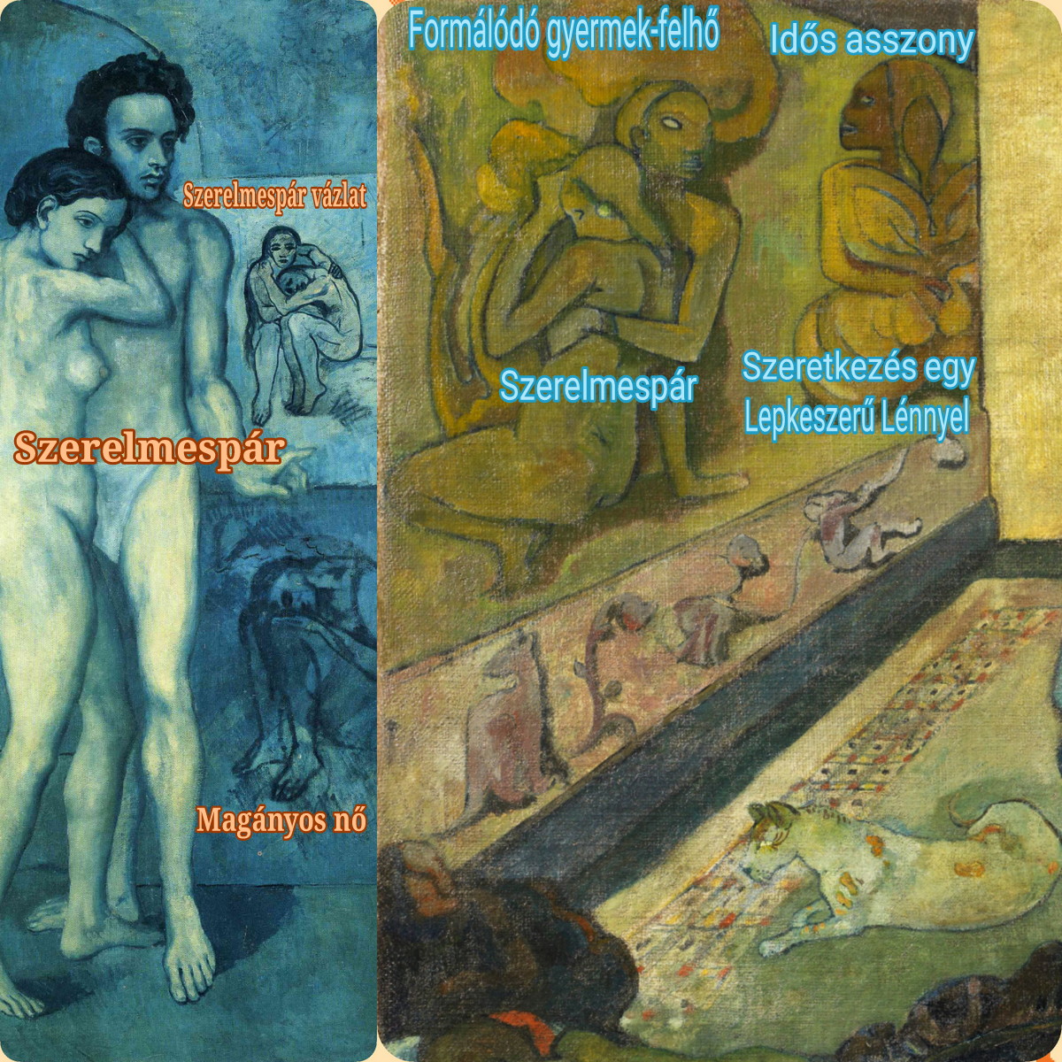 A Szent Családhoz képest Gauguin Az Álom című képének szereplői teljességgel jelentéktelenek, ám Gauguin zsenijének hála őket is övezi egyfajta időtlenség. – De mit is látunk a képen? – Két békésen merengő tahiti nőt – az egyik lótuszülésben ül és félmeztelen – egy bambuszkunyhó mélyén. Kilenc óránál alvó kisgyermeket hatalmas kagylónak tűnő bölcsőben vagy ágyban. Felette egerésző macskát. Az ablakban (két óránál) távoli lovast elügetni a hegyek felé, talán a távozó családapát. Középen a kép eredeti címét maori nyelven – Te Rerioa – díszes domborműként. Végül: hatalmas falikárpitokat a kunyhó falán, melyek Gauguin fantáziájának egyedülálló termékei, a kunyhó falára vetített belső projekciók, minden későbbi szürrealizmusok tetőpontjai. A szemközti falon ősi tahiti istennő teremti meg a növényeket és állatokat. Lábai és bal karja fatörzsekké és faágakká válnak, jobb karja pedig a hegyről leomló zuhataggá. Mandulavágású szemei sejtelmes fényben égnek, míg a lábánál bagzó nyulak üzenete a mindent átható termékenység. Ám legérdekesebb a hatalmas, jobboldali kárpit az egymáshoz simuló szerelmesekkel, akik olyanok, mint Picasso fenti képének légies változatai, a kék helyett ezúttal sárgásbarna színben. Ám ők nem a férfi korábbi feleségétől húzódnak el, hanem egy olyan idősebb asszonytól, akinek alakja szinte teljesen szétfolyik, s aki mintha zsémbelés közben végezne rémálomszerű nemi aktust egy Lepkeszerű Lénnyel! Ahogy Gauguin írja: „Minden álom ezen a képen. De vajon ki álmodja? A gyermek? Az anya? A lovas az ösvényen? Vagy maga a festő?” – Bár Gauguin felvetése alapvetően költői kérdésnek tűnik, ma úgy gondoljuk, hogy a képen látható szexuális szimbólumok és asszociációk a kollektív tudattalan mélyéről törhettek fel, így csakugyan bármelyik szereplő álmodhatta őket, ám megfesteni kizárólag a zseniális Gauguin tudta, évtizedekkel megelőzve Freud és Jung álomfejtéseit és a belőlük kifejlődő szűrrealistákat. Dalí álomképei talán látványosabbak, ám Gauguin képe náluk sejtelmesebb és szuggesztívebb.