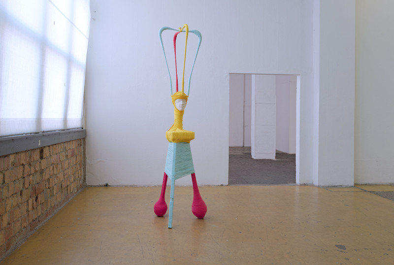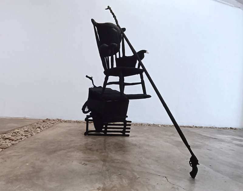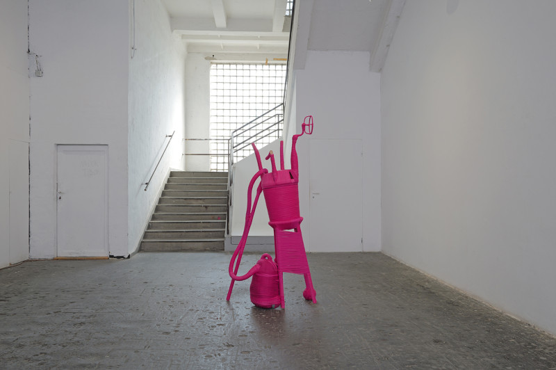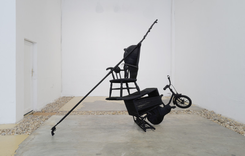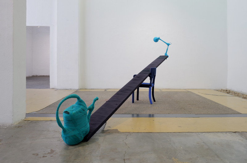 A művész elfedi a tárgyat, hogy a kötözés gesztusával és a térbe helyezéssel, illetve a tárgyak egymás mellé, egymásra helyezésével módosítsa azok formáját, színét, jelentését. A székre helyezett hosszú deszkadarab így lesz olyan libikóka, ahol a fönt és a lent mindig állandó, és a lámpabúra egy adóvevő része, ami a másik teremben lévő szoborral lép kapcsolatba. (Álljanak a két terem közé, és meg fogják látni, igazam van.)