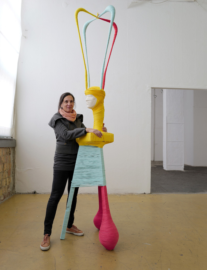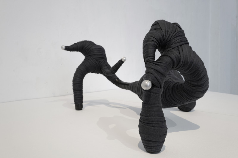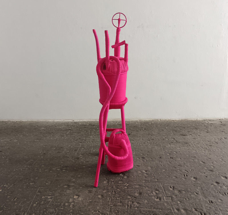 Tehát arról próbálok valamit mondani, hogy ezek a tárgyak bár nem a hagyományos, hétköznapi kontextusban, de a művészet kontextusában nagyon is élő tárgyakká válnak, absztrakt szobrokká. Merthogy az is történik ezekkel a tárgyakkal, hogy a bekötözés folyamán a formák elkezdik magukat előhívni, és új formákká alakulnak. Nézzék meg a hintaszéken keletkező gömbölyded formát, vagy a locsolókanna terpeszkedő alakját, a szobrászállvány gumós lábait.