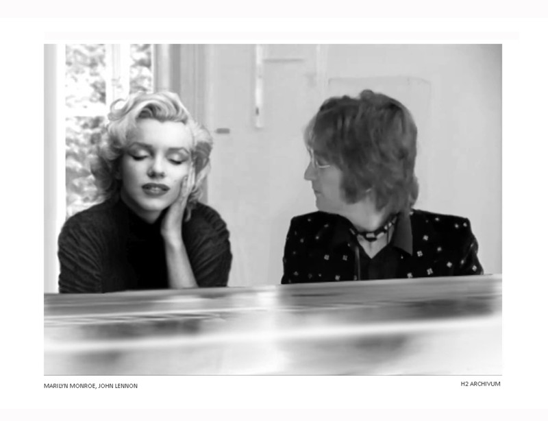 Amint ezt már említettem, az egyik valós kép, ahol a pápa és Andy Warhol a Szent Péter téren kezet fognak egymással. A másik kép, amelyen Albert Einstein és Charlie Chaplin valamilyen fogadáson, ünnepségen vehettek részt. Mindez nem volt tudatos választás. Mind a két kép a transzformálás végére maradt, és feladtam a további próbálkozást a megváltoztatásukra. Viszont nem hagyhattam ki az inspiráló Andy Warhol és II. János Pál-képet. Ekkor jött és rám köszönt az ötlet: 2 maradjon változatlan. Így jött létre olyan sorozat, amelyben a hihető és a hihetetlen, a bizonyosság és a bizonytalanság, az igazság és a hazugság egyszerre van jelen és mint az életben, ezek mérlegelése, eldöntése, egyre jobban ránk van bízva. A kiállítás szándékához támpontot adhat még az a videó, amely a képanyagot dolgozza fel mozgóképekben. Ebben eggyel több kép szerepel, mint a tárlaton. Mégpedig úgy, hogy a közismert videóklipen, a kép egyik felén, a zongora mögött John Lennon az Imagine (Képzeld el) című, a békéről, humánumról, ideáról szóló dalát befejezve oldalra fordul, és mellette, a fotó pillanatnyi merevségében behunyt szemmel a dalt átélően hallgató Marilyn Monroe-t pillantja meg.
