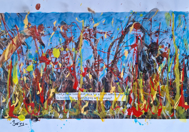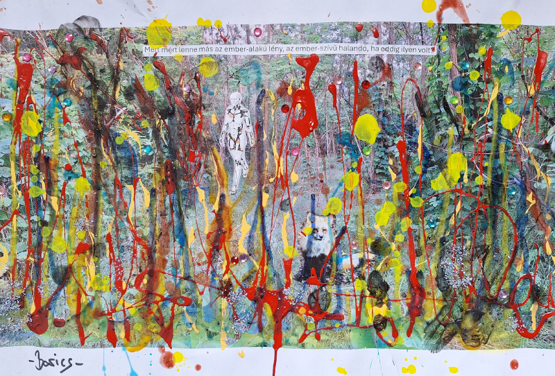 Mivel Juhász Ferenc munkamódszerének szerves részét képezte a művészi parafrázis – hiszen mindent megírtak már –, így az általad választott kollázstechnika kézenfekvő megoldásnak tűnik. Erdős tájakról készült, finoman elmosott fényképháttereid képezik festői értelemben az „alapozást”, miközben Juhász jellegzetes szódzsungeljeit is képesek felidézni. Erre az erdős ágbogas-avaros alapozásra kerülnek fel Juhász versidézetei, illetve a kollázsolt állatképek. Csakhogy van egy kis csavar a történetben. Ugyanis rendszerint nem Juhász tipikus szürreális kreatúráit látjuk, nem valamiféle középkori bestiáriumot, hanem rendkívül békés és bájos állatokat. A nyitóképet uraló kismalac például olyannyira cuki, hogy eljátszhatná Malacka szerepét Micimackó Száz Holdas Pagonyában. Más kérdés, hogy e ropogó avarszőnyeg lesz majd az égből alázuhanó Tűzözön gyújtópontja. E lángnyelvek és vércsíkok jelennek meg Pollockot idéző rendkívül brutális csorgatások és csepegtetések révén az előtérben.