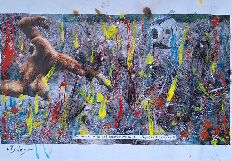 A következő képen olvasható idézet – „Mert bonyolult volt és buta volt” – már nem a Szent Tűzözön regéiből, hanem a későbbi Gyermekdalokból származik. E hatalmas époszban tárja elénk Juhász Ferenc poszthumán vízióját egy potenciális atomháború utáni létezésről. Az általad alkotott kollázs a majommal és Kubrick filmjéből ismerős AI-kamerával az emberi értelem evolúciója, míg a háttérben látható szódzsungelek olyanok, mint az elektródák.