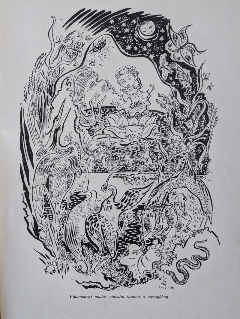 Hincz Gyula illusztrációja Weöres Sándor Hold és felhő című verséhez, Weöres Sándor Zimzizim. Tericum Kiadó, 2001. 36.